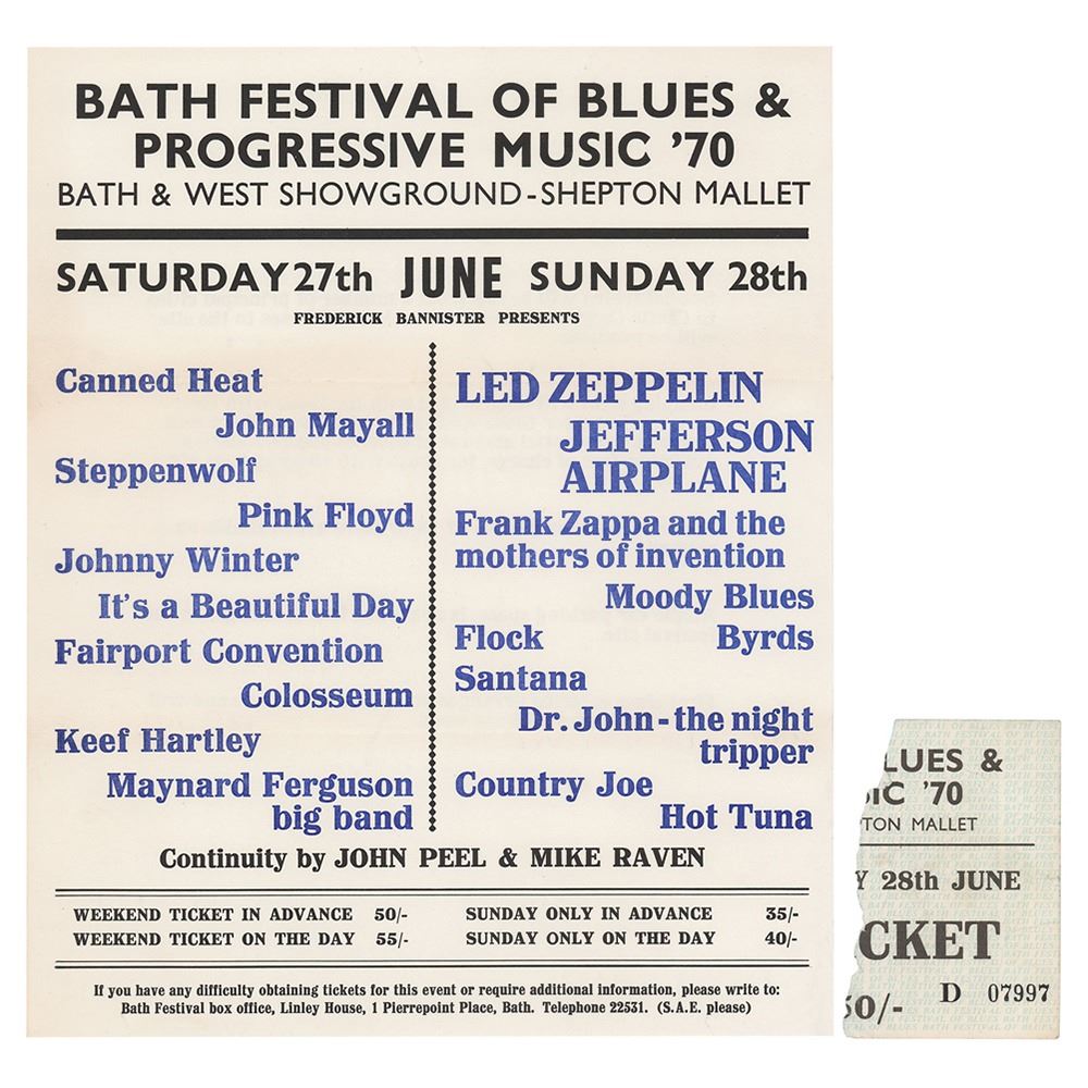 An original 8.25 x 10 handbill promoting the Bath Festival of Blues & Progressive Music at the Royal Bath and West Showground in Shepton Mallet, Somerset, England, on June 27-28, 1970, with Led Zeppelin listed as the headlining act for the Sunday show. Other listed acts include: Pink Floyd, Jefferson Airplane, John Mayall, Canned Heat, Frank Zappa and the Mothers of Invention, the Moody Blues, the Byrds, and Santana. Includes an original 2.25 x 3.25 ticket stub for the festival, issued as ‰ÛÏD 07997.‰Û In overall fine condition.