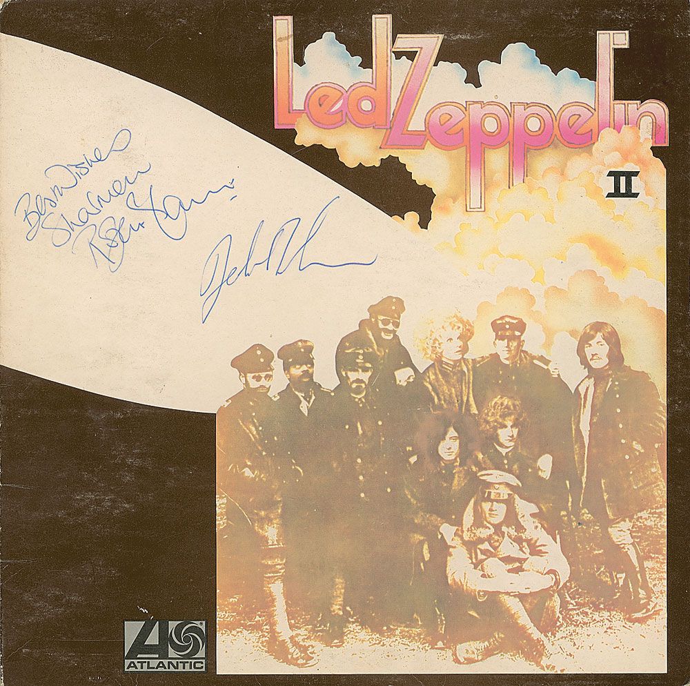Led Zeppelin II album signed and inscribed on the front cover in blue ballpoint, “Best wishes Sharman, Robert Plant,” and “John Bonham.” Scattered light creases, surface rubbing, and a mild ‘ring of wear’ to back cover, otherwise fine condition. The record is included. Accompanied by a certificate of authenticity from Tracks and a letter of provenance from the original recipient, a neighbor of Bonham’s, which reads, in part: “I asked Mrs. Bonham (pat) if John would give me his autograph and, as a result of that conversation, I took round a copy of Led Zeppelin II, met John Bonham and Robert Plant, and they autographed the album for me.”