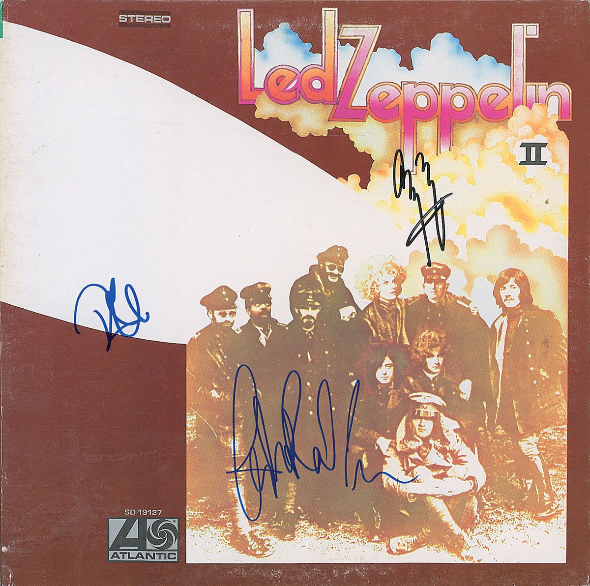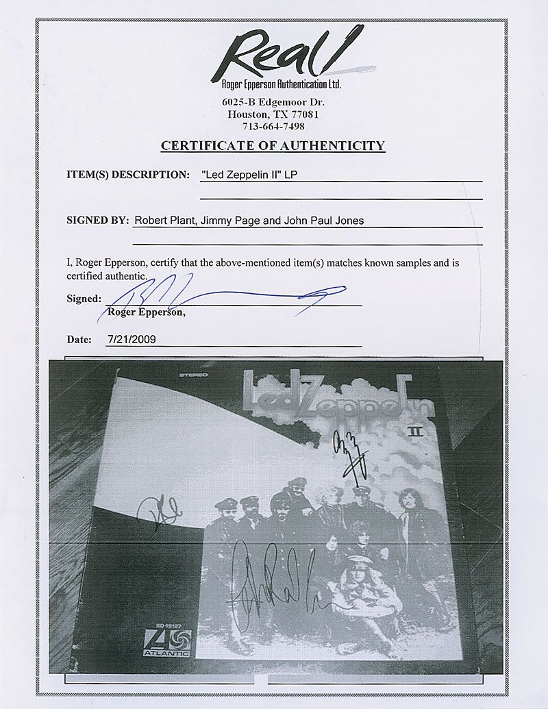 Led Zeppelin II album signed on the front cover in black felt tip by Jimmy Page, and blue felt tip by Robert Plant and John Paul Jones. In fine condition, with a ding to the lower left corner, some slight rubbing wear to the front cover, and a light ‘ring of wear’ to the back cover. The record is included. Accompanied by certificate of authenticity from Roger Epperson/REAL.