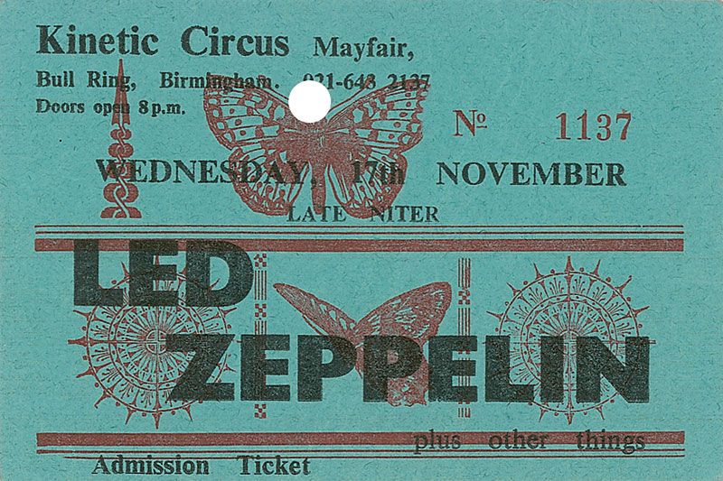 Original concert ticket, 4.5 x 3, from the band’s performance at the Kinetic Circus in Birmingham, UK, on November 17, 1971. The band played 12 songs at the show including ‘Whole Lotta Love,’ and ‘Stairway to Heaven.’ In fine condition, with a single punch hole to top edge. Accompanied by a certificate of authenticity from Tracks.