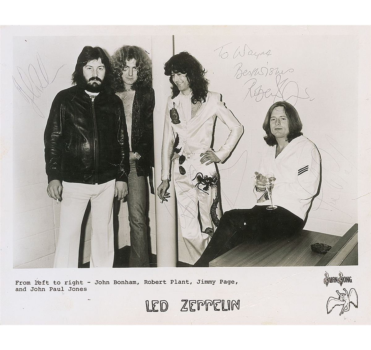 Remarkable vintage glossy 10 x 8 Swan Song Records publicity photo of the full group, signed and inscribed in black ballpoint, “To Wayne, Best wishes, Robert Plant,” “John Bonham,” “Jimmy Page,” and “John Paul Jones.” In very good condition, with overall creases, a small tape-repaired tear to the right border, and John Paul Jones and Jimmy Page signatures a shade or two light, though fully legible—the Bonham and Plant signatures remain fairly strong. Accompanied by a certificate of authenticity from Roger Epperson/REAL and a full letter of authenticity from JSA. Also accompanied by a letter of provenance from the original recipient, who states that his aunt worked at Swan Song and obtained the signatures for him at Madison Square Garden in 1977 as the band prepared for their performance. Complete Zeppelin items are quite scarce and highly desirable, and photos are particularly so—this is just the second fully-signed group photo we have ever offered.