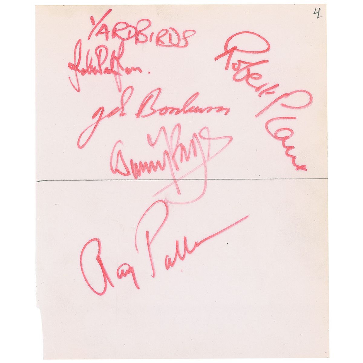 Vintage red felt tip signatures of Robert Plant, Jimmy Page, John Bonham, and John Paul Jones on an off-white 5.5 x 7 sheet, labeled at the top in an unknown hand, “Yardbirds,” and an additional signature to bottom half of sheet. In fine condition, with a central horizontal pencil line. An incredibly early set of signatures, as the Yardbirds would change the name of their group to Led Zeppelin, partly due to a cease-and-desist order from former member Chris Dreja, and partly due to a comment by Who drummer Keith Moon that the band would go down like a ‘lead zeppelin.’
