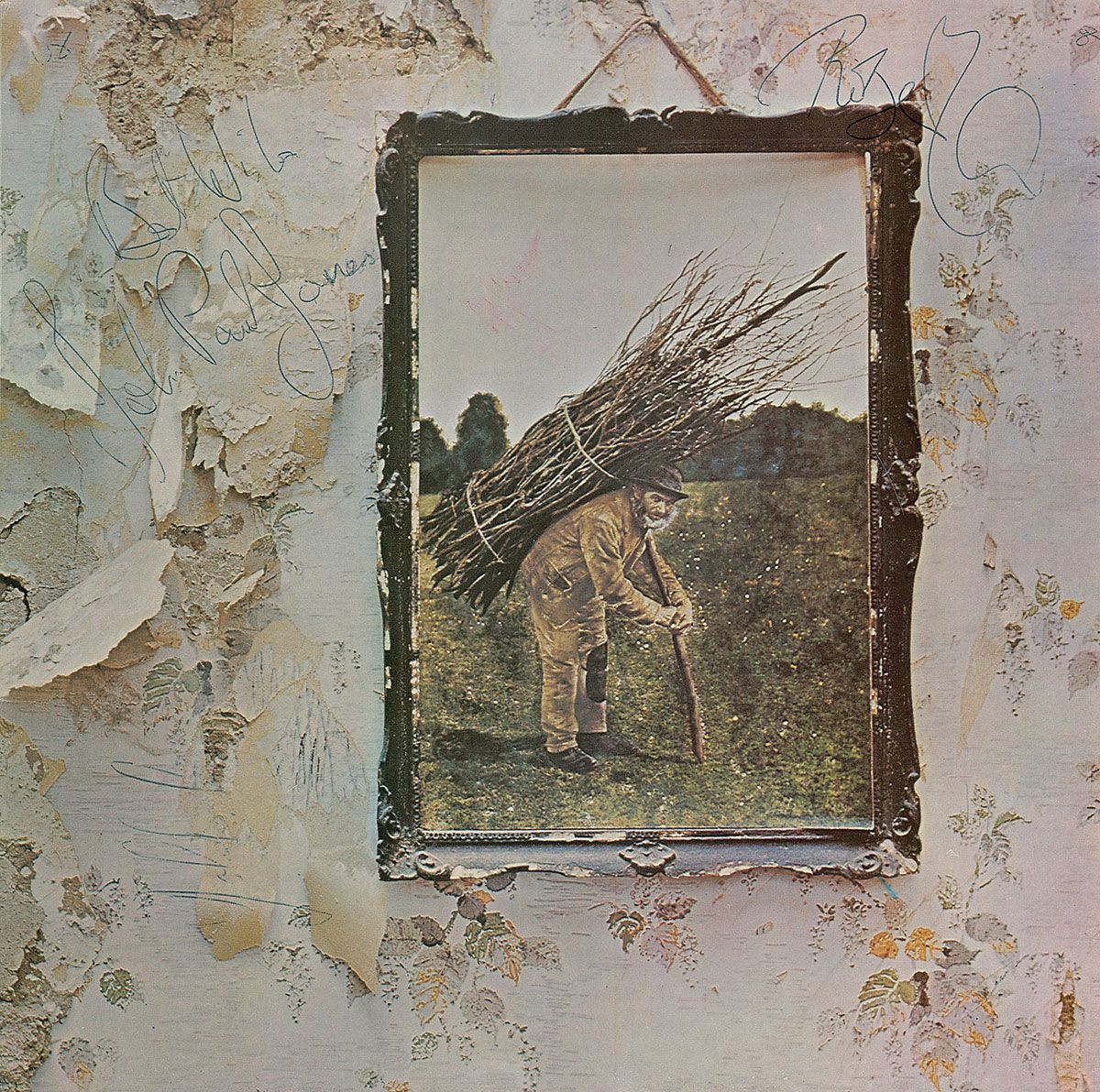 Led Zeppelin IV signed on the front cover in blue ballpoint by Robert Plant, John Bonham, and John Paul Jones, who adds, “Best Wishes,” and signed in red ballpoint by Jimmy Page. In very good condition, with a full separation to the bottom edge of the back cover, moderately irregular ink adhesion to Bonham’s partially-legible signature, and very poor adhesion to Page’s, legible by the imprints of the pen. The record is included. Accompanied by a full letter of authenticity from Roger Epperson/REAL and a certificate of authenticity from Tracks. A remarkable grouping of signatures, particularly on this album; released in 1971, it was the band’s most critically acclaimed work, certified 23x platinum, and is recognized as the third best-selling album in the US, ever.