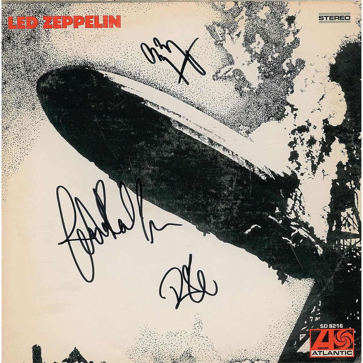Led Zeppelin debut album signed on the front cover in black felt tip by Robert Plant, Jimmy Page, and John Paul Jones. In fine condition. The record is included. Accompanied by a full letter of authenticity from Roger Epperson/REAL.