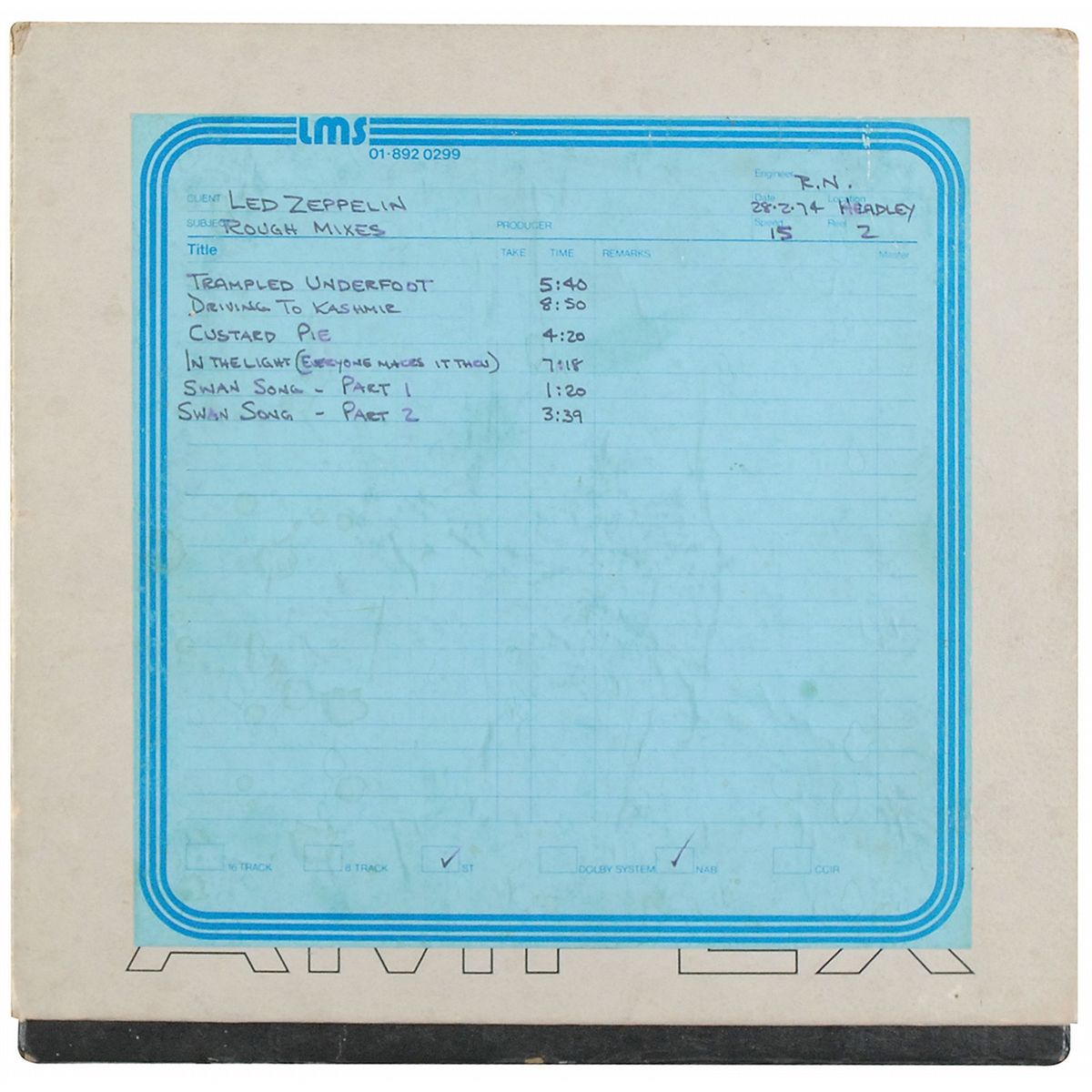 Vintage 10? tape reel of unreleased studio mixes from Led Zeppelin’s 1975 album Physical Graffiti, recorded on Ampex 406 quarter-inch tape. Affixed to the box is a large Ronnie Lane's Mobile Studio (LMS) label, hand-notated with the track listing and recording data. Top of the label is filled out with the following info: “Client: Led Zeppelin, Subject: Rough Mixes, Engineer: R. N., Date: 28-2-74, Location: Headley, Speed: 15, Reel: 2.” Song titles and times are listed as follows: “Trampled Underfoot—5:40,” “Driving to Kashmir—8:50,” “Custard Pie—4:20,” “In the Light (Everyone Makes It Then)—7:18,” “Swan Song—Part 1—1:20,” and “Swan Song—Part 2—1:20.” Along the bottom, the “ST” and “NAB” boxes are checked off. In fine condition. These tapes are being sold as a historical artifact and no copyright to the recorded material is claimed nor transferred by the auction house. Originates from the personal collection of legendary engineer and producer Ron Nevison.
