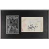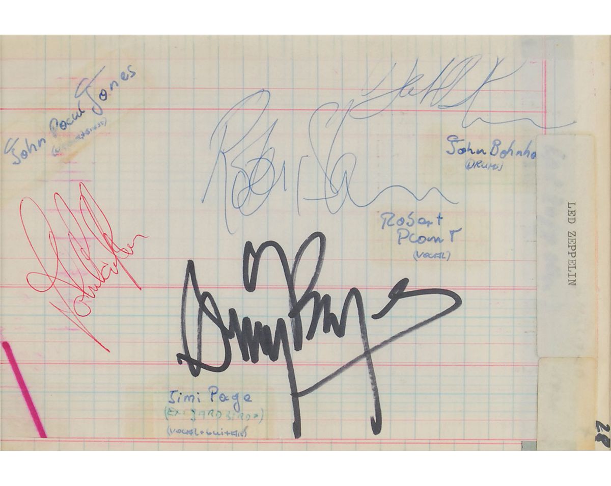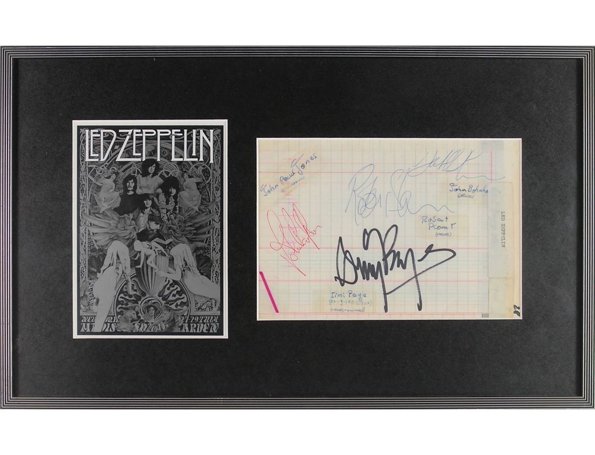 Scarce vintage ballpoint and felt tip signatures of Robert Plant, Jimmy Page, John Bonham, and John Paul Jones on an off-white 8 x 5.5 sheet of lined graph-like paper, with collector’s notation next to signatures and a small label affixed to right edge. Matted and framed with a small reproduction of a concert poster to an overall size of 18.25 x 11. In fine condition, with some light blocks of toning over notations and edges, with a bit over the top of Bonham’s signature. Accompanied by a certificate of authenticity from Roger Epperson/REAL. Complete vintage signatures of the band members are quite uncommon and are highly coveted by serious rock and roll collectors.