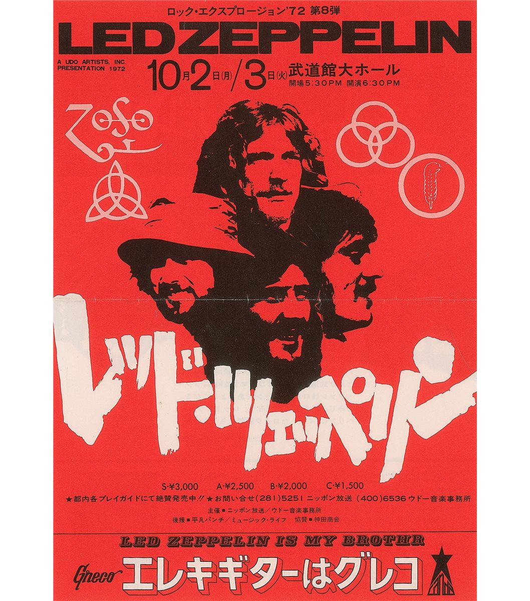Japanese handbill for Led Zeppelin’s concerts in Tokyo on October 2–3, 1972, unsigned, 7 x 10, featuring information and images on both sides. In fine condition, with a central horizontal fold.