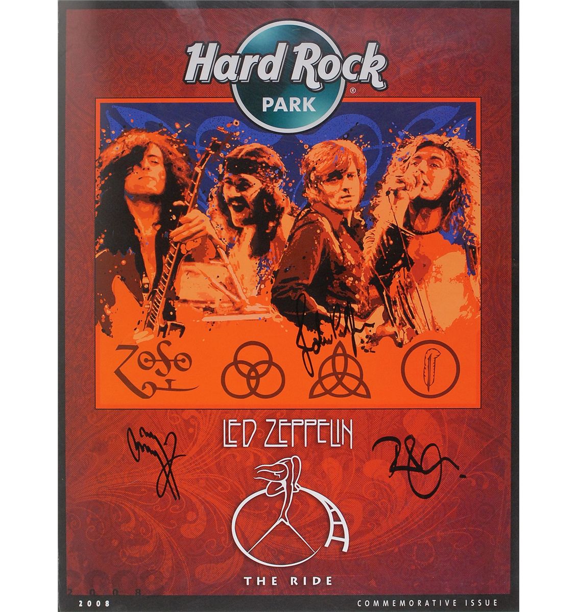 Color 18 x 24 poster for the Hard Rock theme park’s Led Zeppelin ride, signed in black felt tip by Robert Plant, Jimmy Page, and John Paul Jones. Rolled and in fine condition. Only 20 of these posters were signed and presented to VIP guests at the grand opening of the Hard Rock theme park.