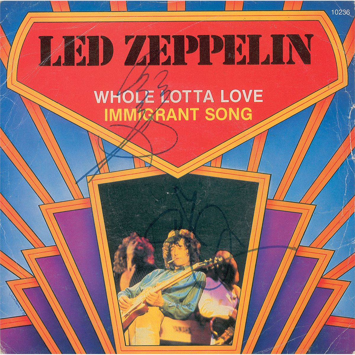 Color 1979 Belgium 45 rpm record sleeve for ‘Whole Lotta Love/Immigrant Song,’ signed in blue felt tip by Robert Plant and Jimmy Page. In very good condition, with moderate contrast to Plant’s signature and scattered creasing.