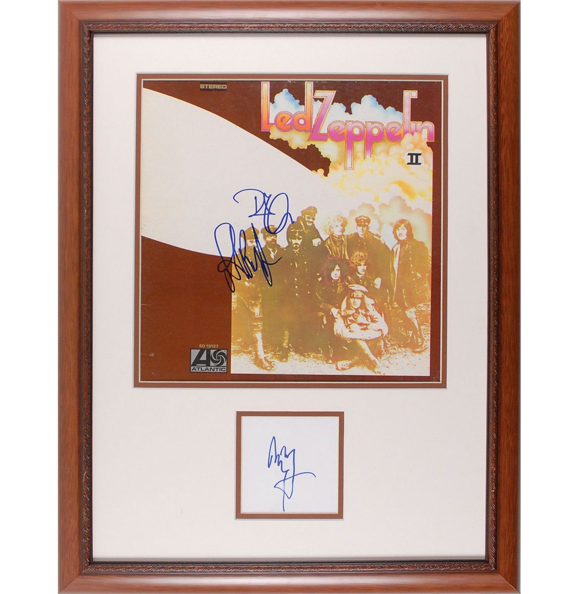 Led Zeppelin II album signed on the front cover in blue felt tip by Robert Plant and John Paul Jones; and a felt tip signature of Jimmy Page on a white 3.75 x 3.75 card. Archivally double-matted and framed together to an overall size of 19 x 24.5. In fine condition. The record is not included. Oversized.