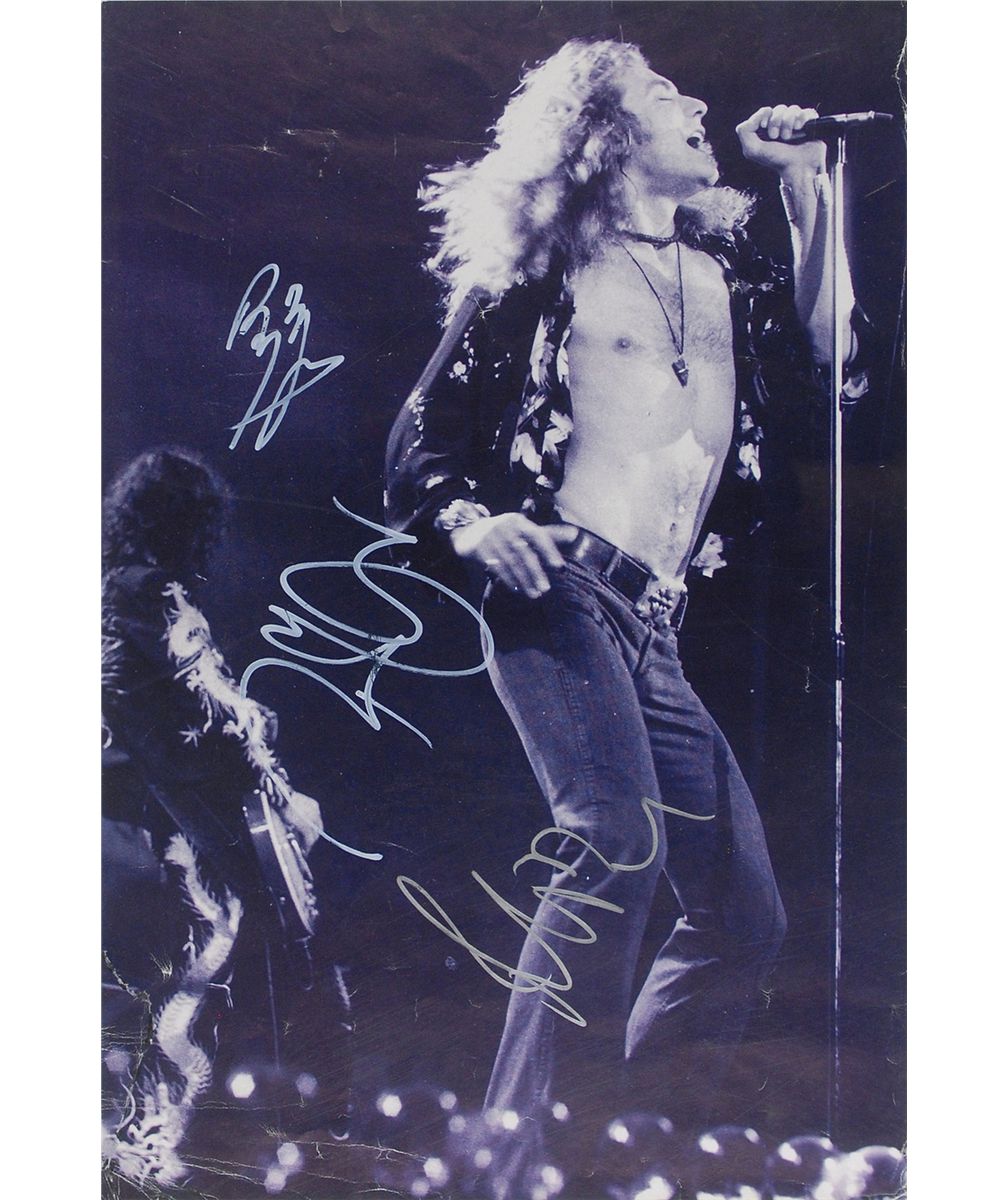 Uncommon 11 x 16.5 mini poster of a classic Led Zeppelin performance, signed in white paint pen and silver ink by Jimmy Page, Robert Plant, and John Paul Jones. In very good condition, with moderate overall creases, a repaired tear to the lower left corner, and a few trivial scratches to the white signatures. Accompanied by a letter of provenance from the original recipient, stating that the Plant and Page signatures were acquired in Sydney, Australia, in 1995–96, and that John Paul Jones was acquired at the Sydney airport in 2010; also includes images of the collector with Plant and Page when they met.