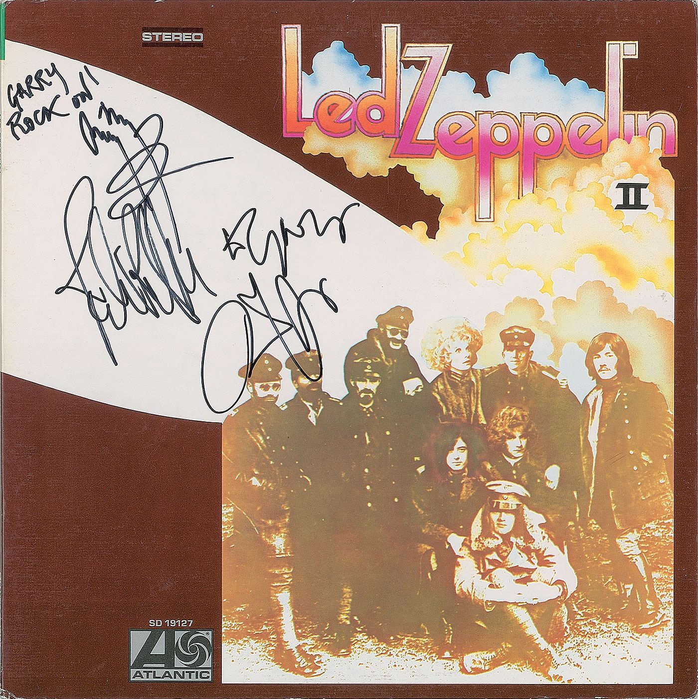 Led Zeppelin II album signed and inscribed on the front cover in black felt tip, "Garry, Rock on! Jimmy Page," "To Gary, Robert Plant," and "John Paul Jones." In fine condition. The record is included. Accompanied by a full letter of authenticity from PSA/DNA.