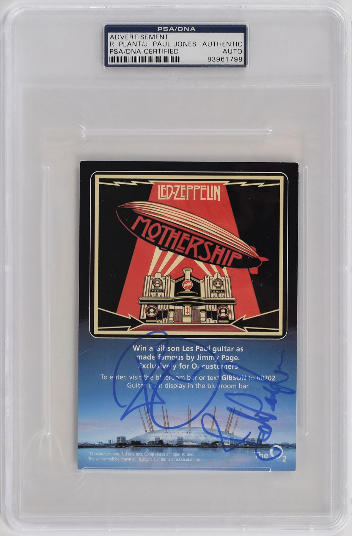Uncommon O2 Arena promotional card offering a chance to win a Les Paul guitar, 4 x 5.75, signed in blue felt tip by Robert Plant and John Paul Jones. Encapsulated in a plastic PSA/DNA authentication holder. In fine condition.