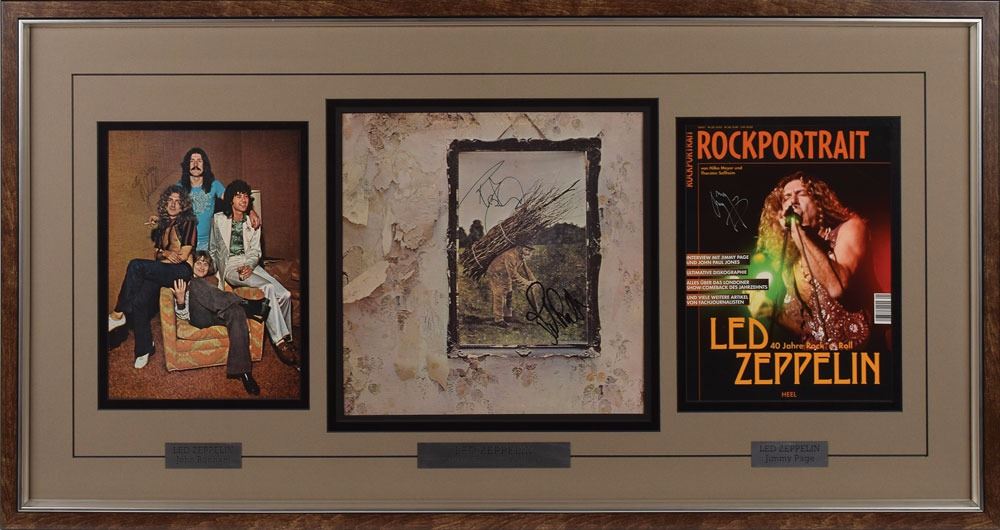 Fantastic display featuring three signed items: a rare vintage color 7.5 x 10.5 magazine photo of Led Zeppelin, signed and inscribed in the upper left in black felt tip, "To Tom, John Bonham"; a Led Zeppelin IV album cover, 11.75 x 11.75, signed in black felt tip by Robert Plant and John Paul Jones; and a color 8 x 10.75 German Rockportrait book cover, signed in silver ink by Jimmy Page. Impressively double-matted and framed together with nameplates to an overall size of 39 x 20.5. In overall fine condition. Accompanied by full letters of authenticity from REAL for all three items. Given Bonham's elusive signature, this is an exceptionally desirable complete set of Zeppelin autographs.