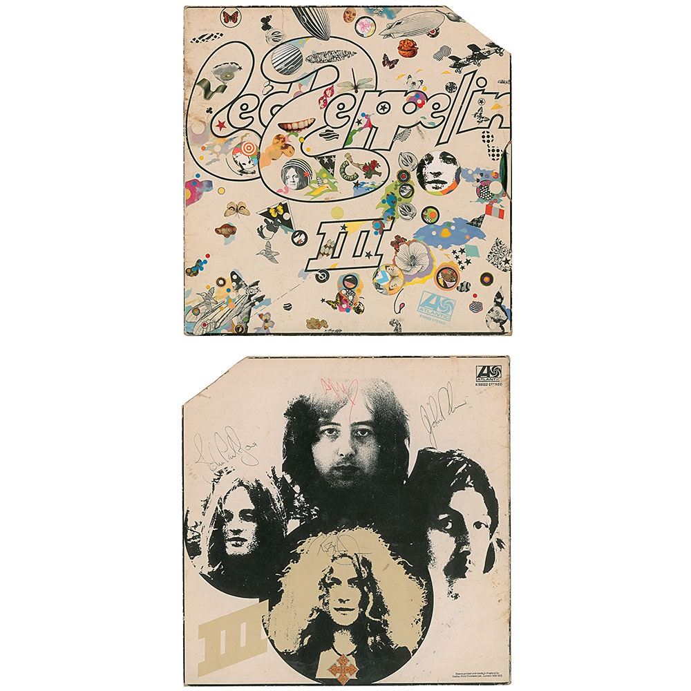 Led Zeppelin III album signed on the back cover in black ballpoint by Robert Plant, John Bonham, and John Paul Jones, and on the front cover in red ballpoint by Jimmy Page. In very good to fine condition, with light scratching, creasing, and edge wear, and the upper corner clipped off, indicating that the album was a promotional copy. The record is included.