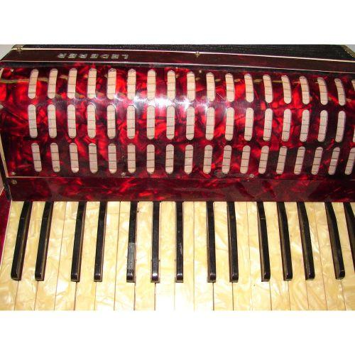 Burgandy Red & Black marbelized case with mother of pearl keys 80 bass 34 treble. 17 3/4" keyboard x 15"x7".Chip on key. Good condition.