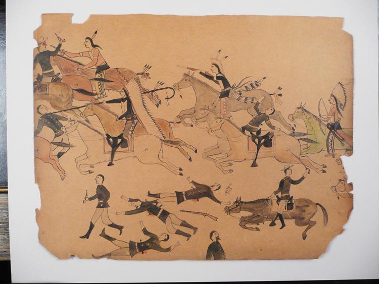 Old Ledger Drawing (Possibly by John Grass) From label on verso "Sioux Indian drawing, said to be Custer Fight, aquired from family of Chief John Grass" From the Richard Manipor Collection, Nevada City, CA 11 3/4" x 15 1/4"