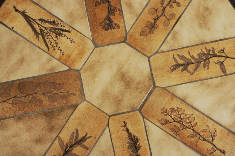 13h x 34dia inches, high glazed ceramic tiles with inprinted leaves, wooden base