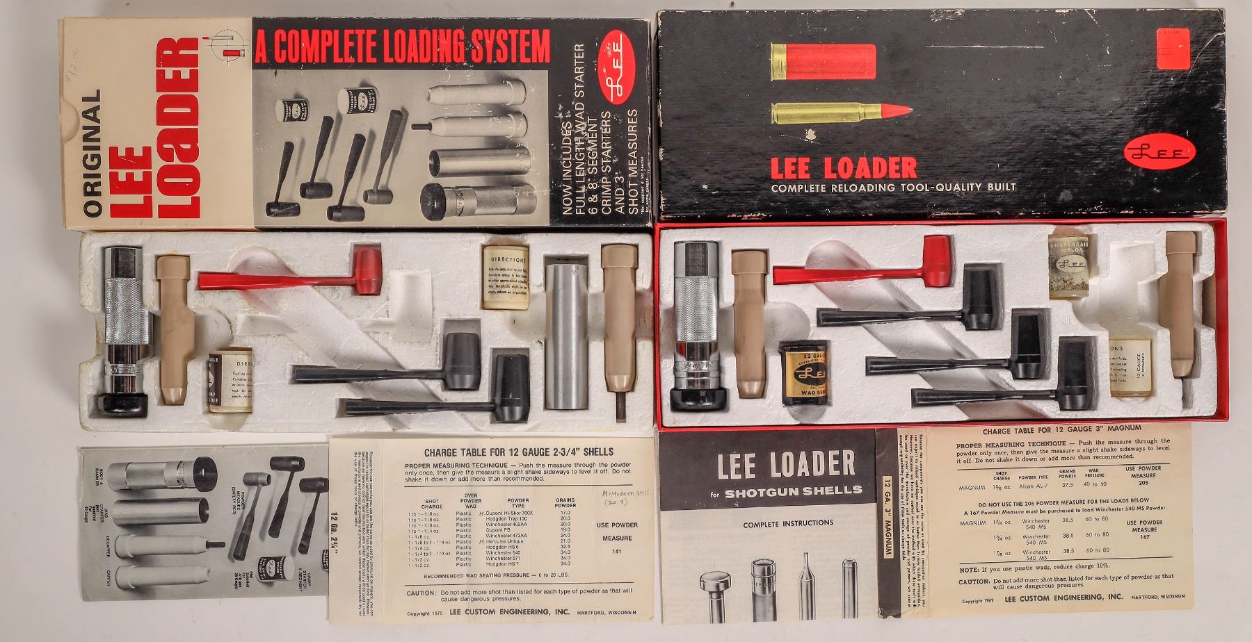 These two Lee 12 ga. reloading kits are used, with enough tools to reload small volumes of handloaded specialty ammunition. In an era where lead can no longer be used for waterfoul and upland game in most states (since 1986) and outlawed in the UK in (2024) you can now reload on a table at home or garage. These tools can be very useful when reloading for antique shotguns, brass hulls, paper and plastic hulls, non-toxic bismuth, or other specialty shot like tungsten where precision and chamber pressure must be controlled. Why pay extreme prices for specialty ammo. when you can load it at home? (Visit ballisticproducts.com).