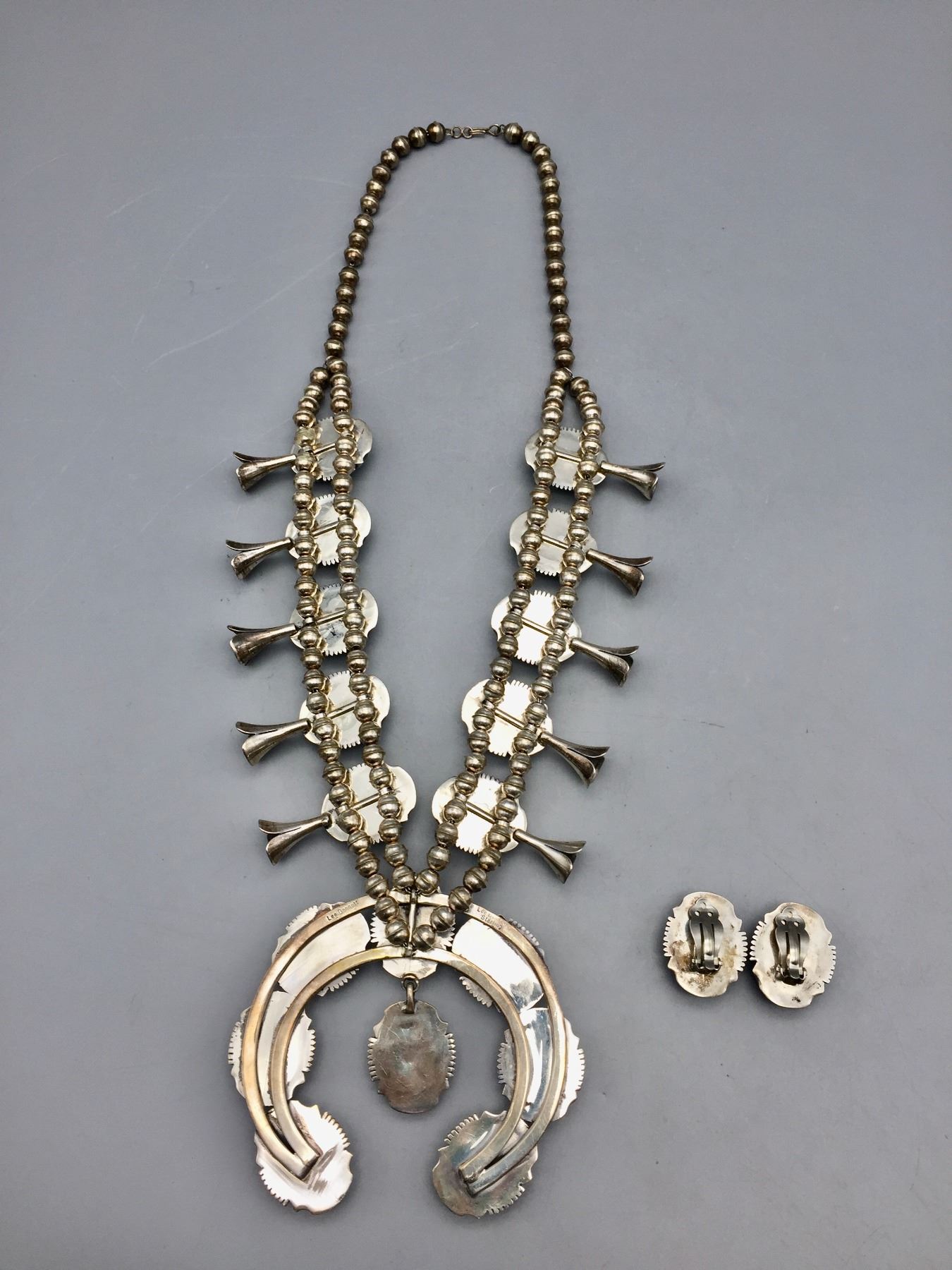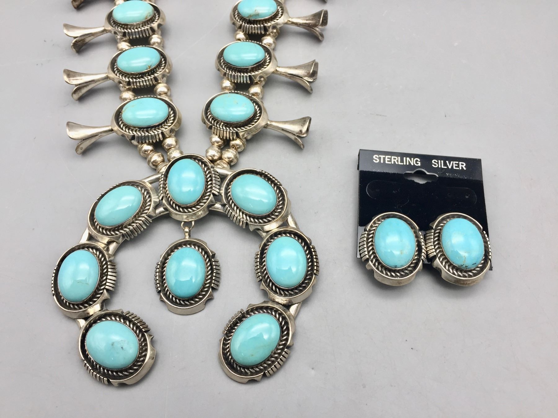 Description: Available for your bidding enjoyment, we offer this gorgeous squash blossom necklace and earrings set featuring nice turquoise cabochons surrounded by hand crafted sterling silver! A nice looking set created by Lee Bennett. Maker: Lee Bennett, Navajo. Approx. Age: Contemporary. Size: Fits a 25” neck. Naja measures 4”w x 3-1/2” long. Earrings measure 1”w x 1-1/4” long. Combined weight of 337 grams. Condition: Good for their age, normal wear expected. Please look closely at the pictures - they are an important part of our description. Shipping: There will be a $5 handling / packaging fee for shipping this lot. The actual cost of postage will be added on top of that.