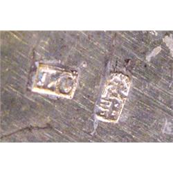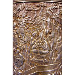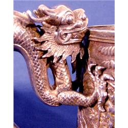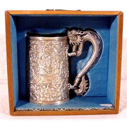 "Lee Ching" (Canton Honam) silver china trad mug with presentation cartouche, Ca. 1850; includes original fitted teak, silk lined box; maker's impression "LC" on bottom of tankard, plus paper label on inside sliding cover of box; tankard adorned with Chinese royalty, scholars, servant and warriors amidst various scenes including buildings, sea, flowers & trees; warriors shown riding land & aquatic animals; medallion in center of tankard is inscribed "Serg'ts Annual Competition Cup for 1875 Won By A'r Serg't L. Smallwood 80th Reg."; handled formed in the shape of scaled sea dragon; intricate detail; some scratches and good overall condition; box has some loss at base; tankard 5.5" tall x 5.5" wide; 12 troy oz.; box is 7.5" wide x 7" deep x 4.5" tall.