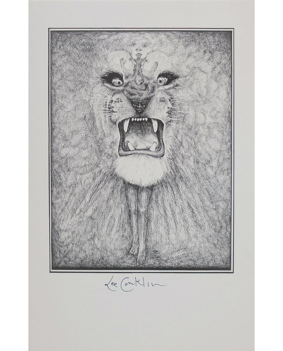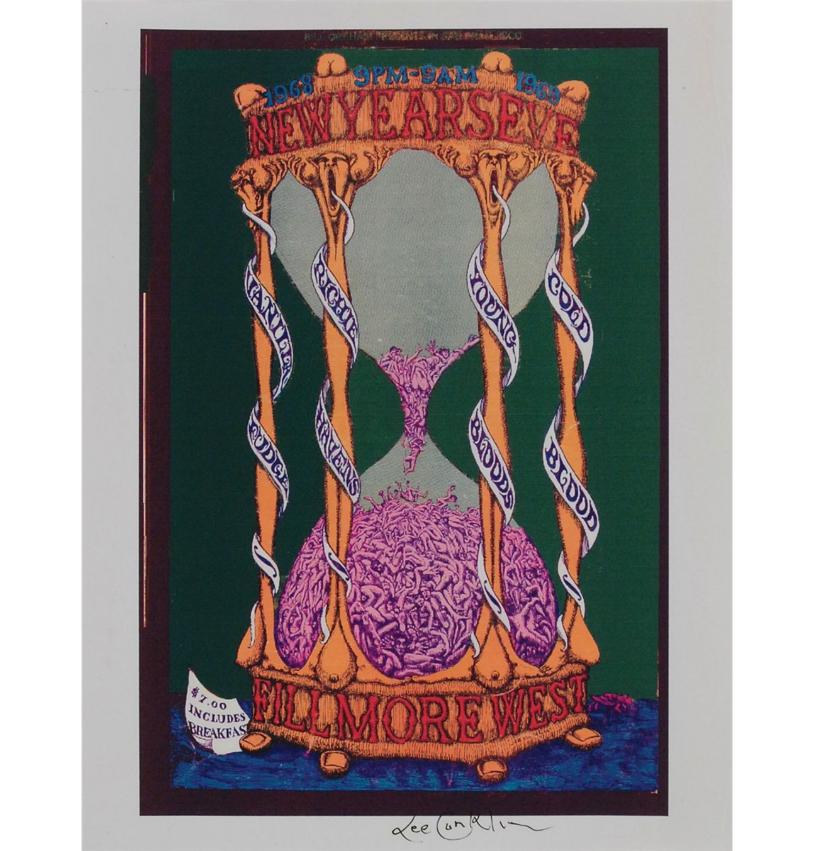 Two prints: one 11 x 17 print of Conklin’s design for Santana’s 1969 debut album, signed in the lower border in black felt tip by Conklin; and one color 8.5 x 11 print of one of Conklin’s 1968 Fillmore West concert posters, signed in the lower border in black felt tip. In overall fine condition.