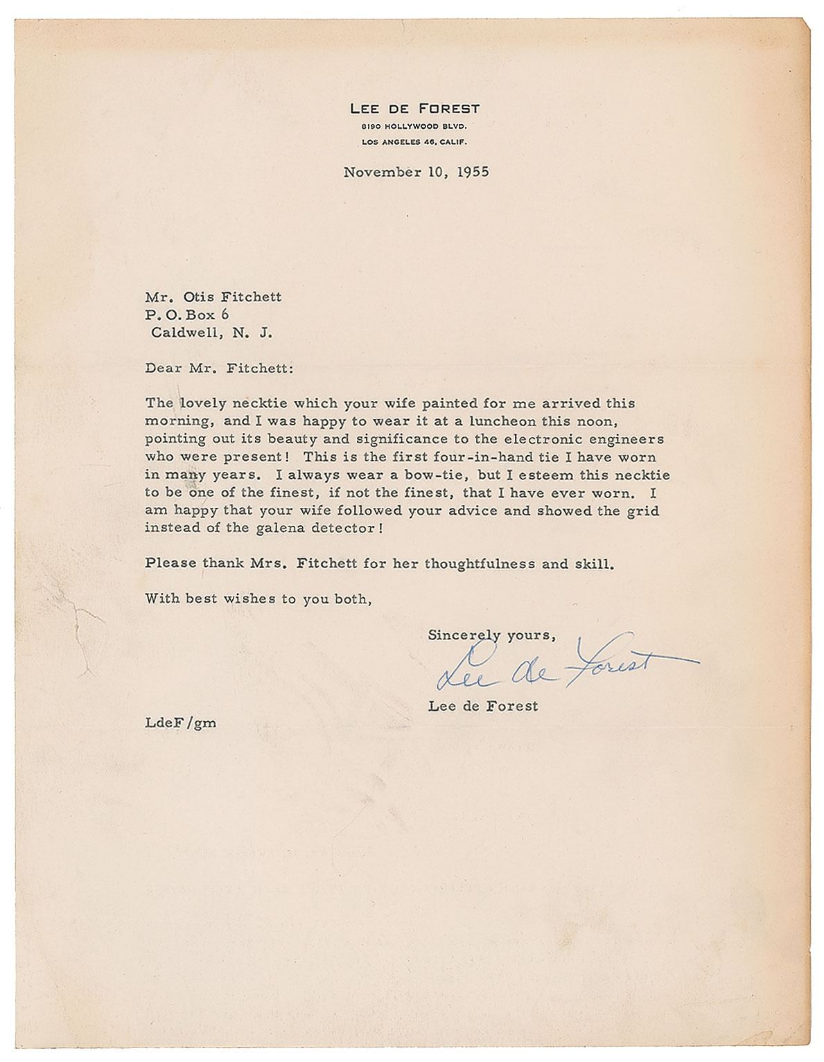 TLS, one page, 8.5 x 11, personal letterhead, November 10, 1955. Letter to Otis Fitchett, in part: "The lovely necktie which your wife painted for me arrived this morning, and I was happy to wear it at a luncheon this noon, pointing out its beauty and significance to the electronic engineers who were present! This is the first four-in-hand tie I have worn in many years. I always wear a bow-tie, but I esteem this necktie to be one of the finest, if not the finest, that I have ever worn. I am happy that your wife followed your advice and showed the grid instead of the galena detector!" In very good to fine condition, with light edge creasing and toning, and a tear to the left margin.