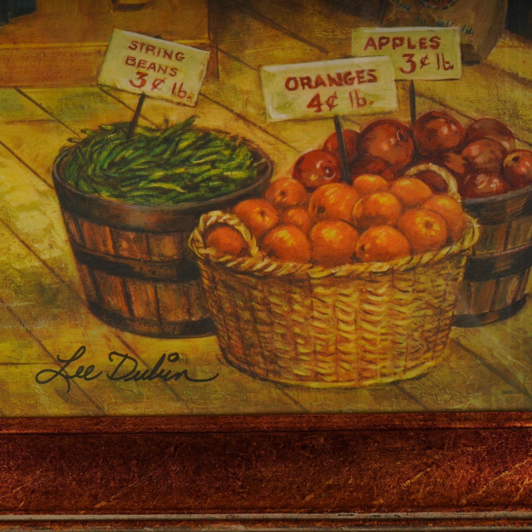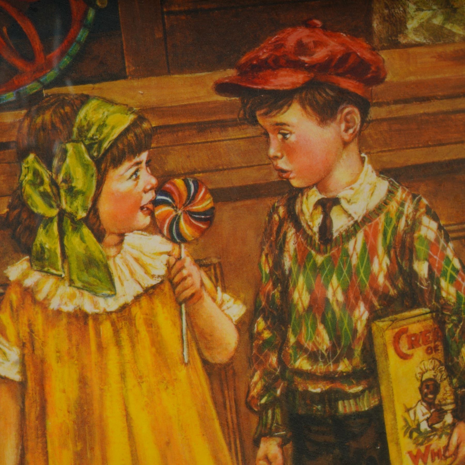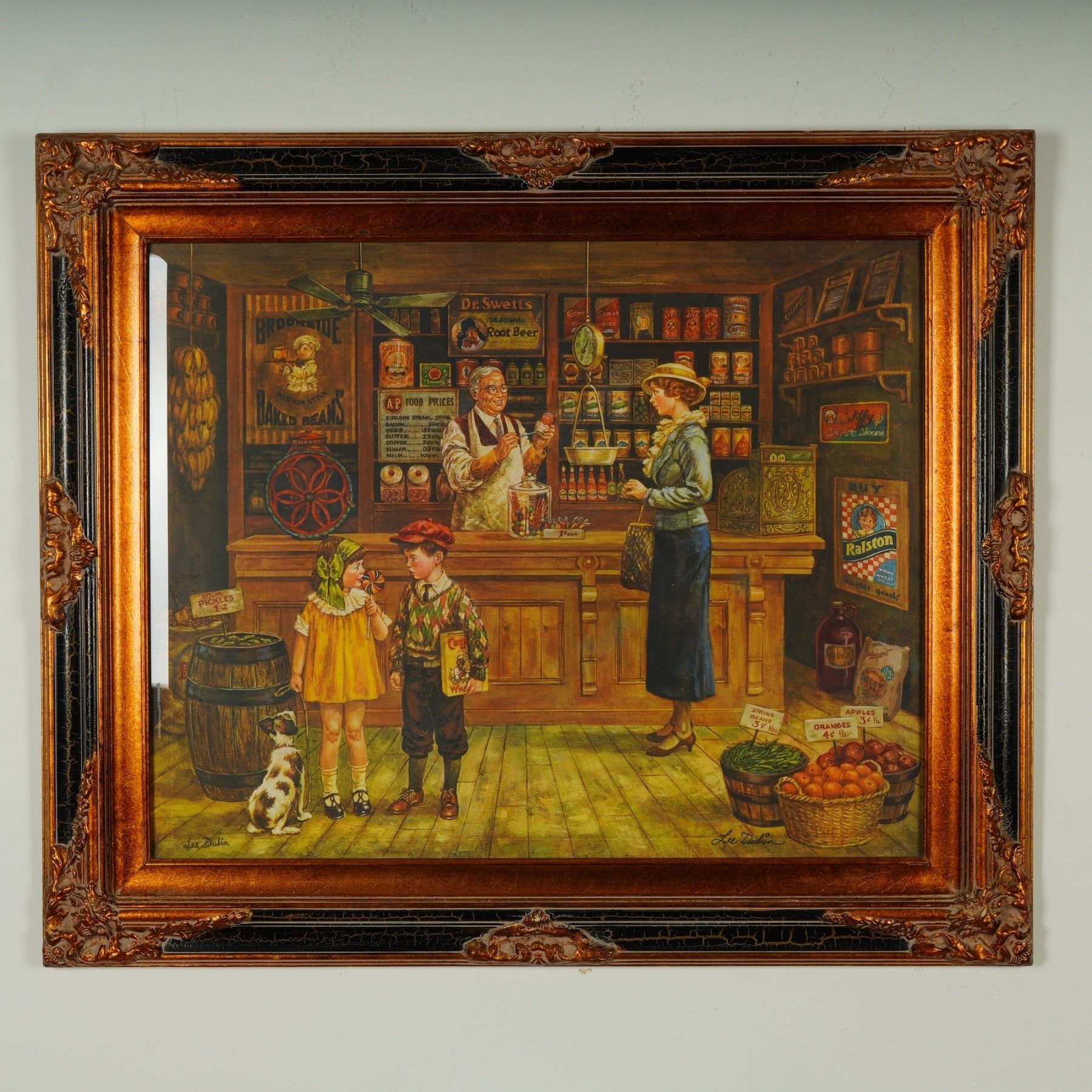 Step into a heartwarming moment from the past with this delightful color lithograph titled 1932 General Store by acclaimed American artist Lee Dubin. Capturing a bustling scene in a Depression-era general store, this vibrant print is bursting with nostalgic charm. A smiling shopkeeper offers candy to a smartly dressed woman, while two children stand in wonder, one clutching a colorful lollipop, the other holding a box of cereal. From the scale on the counter to the vivid advertisements on the wall, every detail immerses you in the spirit of a bygone era. This hand-signed piece by Lee Dubin, visible at the lower right, is rich in color and atmosphere, presenting a warm and sentimental narrative that continues to resonate with collectors of Americana and vintage illustration. The work is housed in a substantial, ornate wood frame with a gold and black finish, enhancing the artwork's nostalgic tone and visual impact. Signature in plate on lower left and hand-signed lower right.