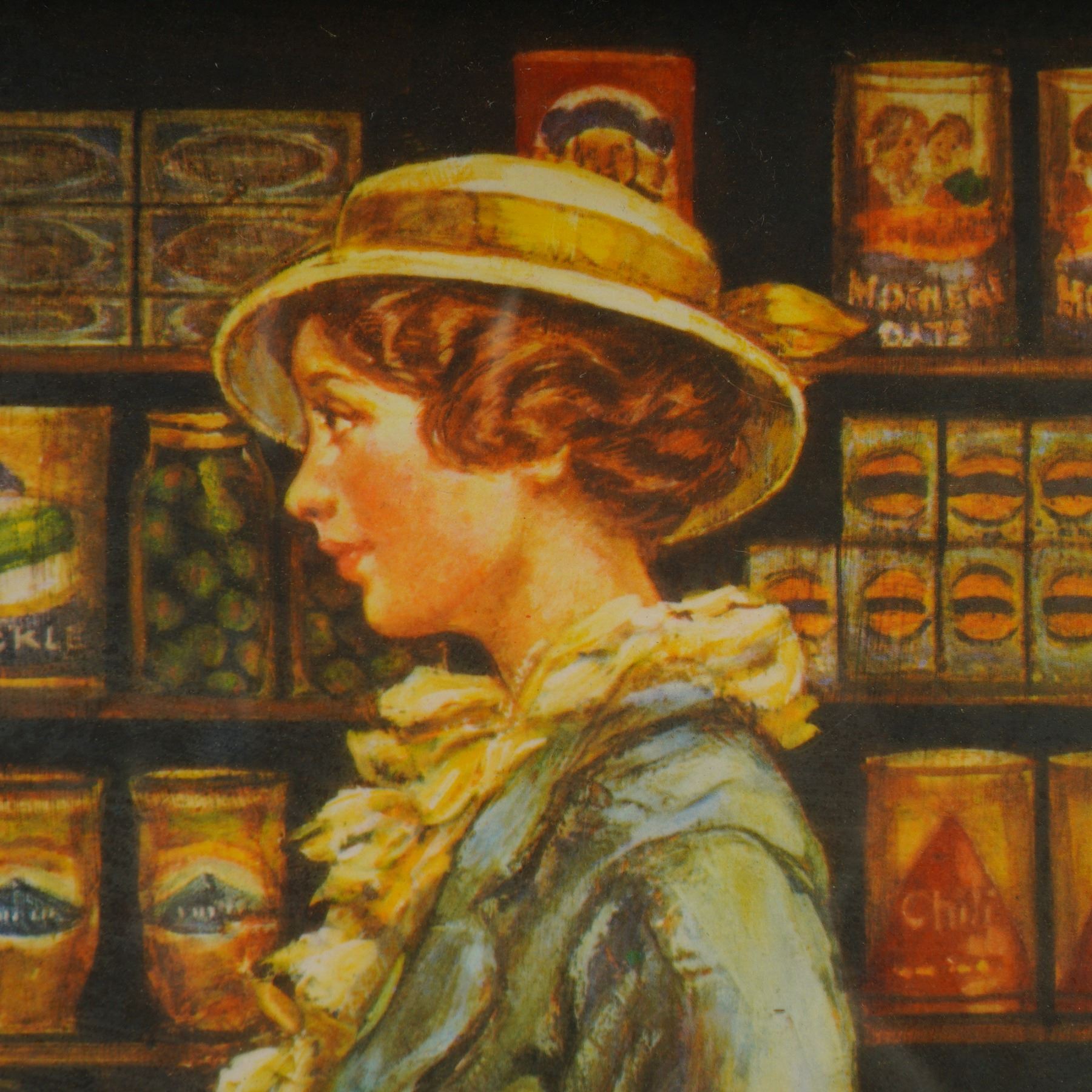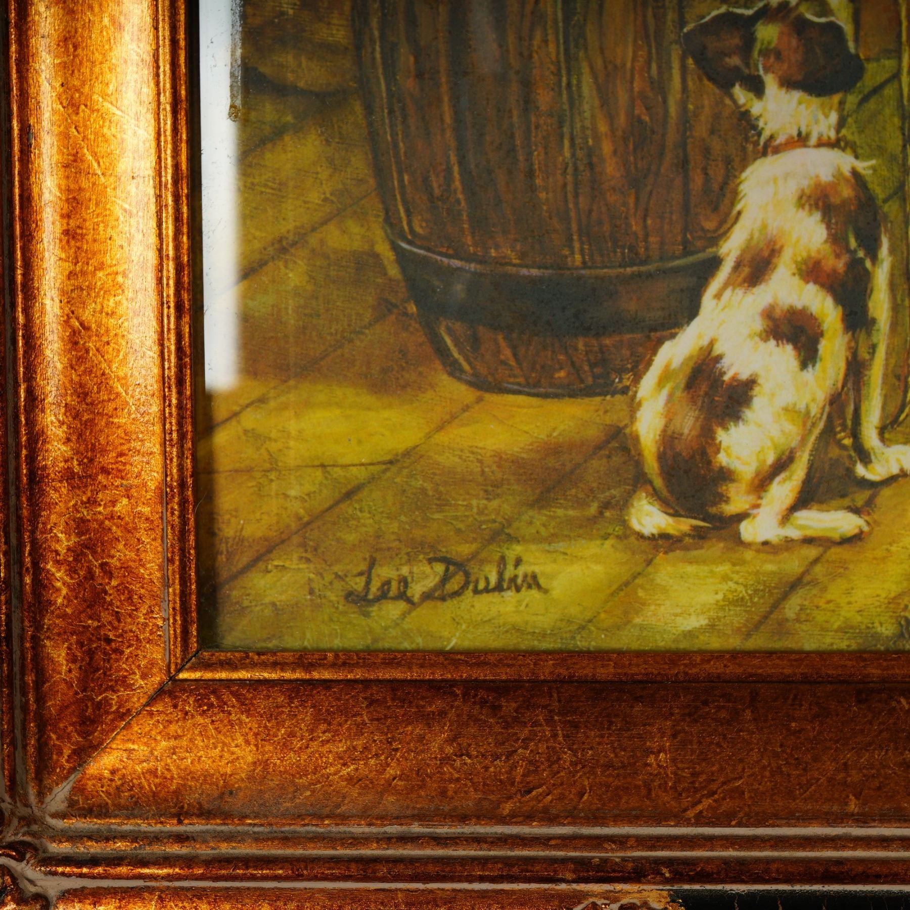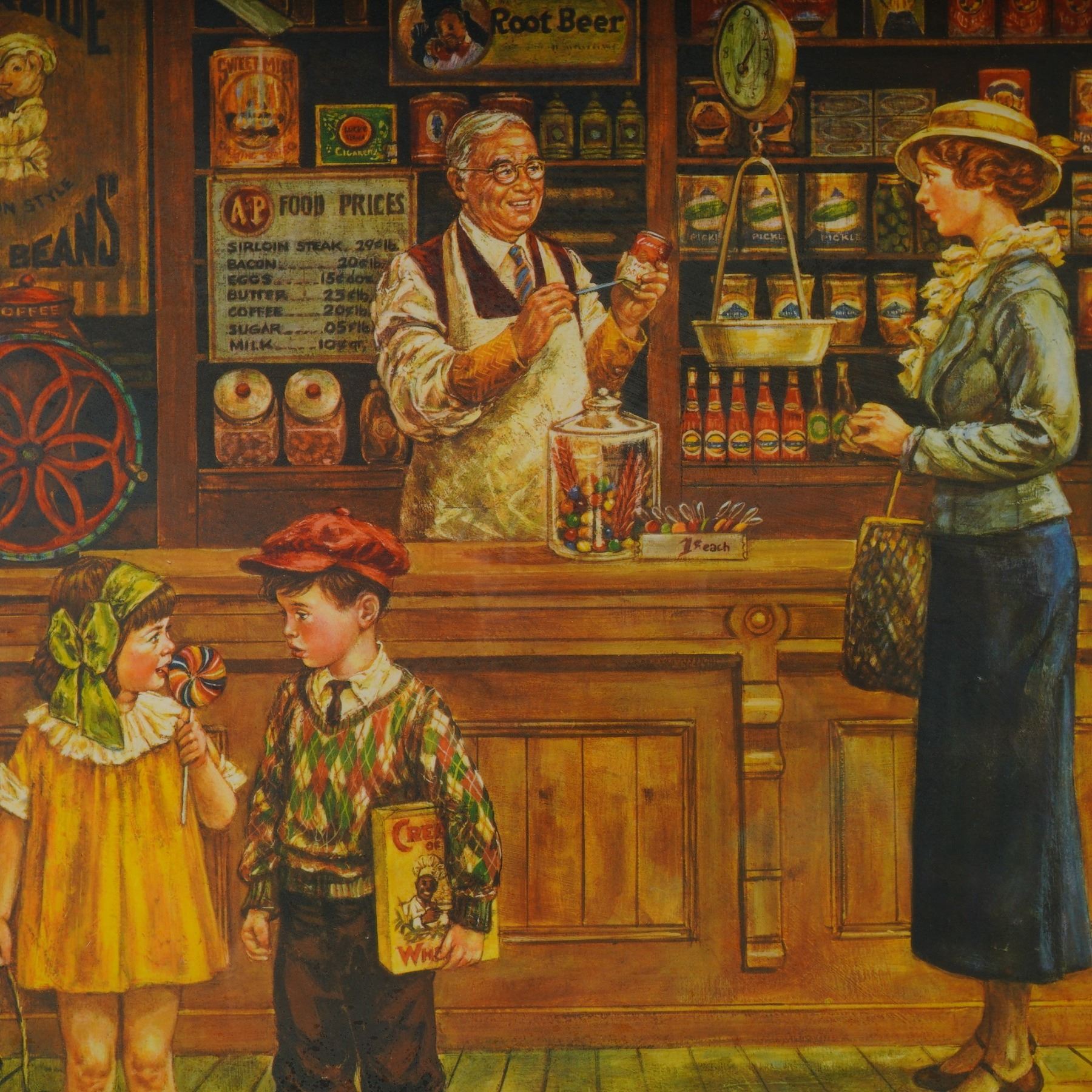Step into a heartwarming moment from the past with this delightful color lithograph titled 1932 General Store by acclaimed American artist Lee Dubin. Capturing a bustling scene in a Depression-era general store, this vibrant print is bursting with nostalgic charm. A smiling shopkeeper offers candy to a smartly dressed woman, while two children stand in wonder, one clutching a colorful lollipop, the other holding a box of cereal. From the scale on the counter to the vivid advertisements on the wall, every detail immerses you in the spirit of a bygone era. This hand-signed piece by Lee Dubin, visible at the lower right, is rich in color and atmosphere, presenting a warm and sentimental narrative that continues to resonate with collectors of Americana and vintage illustration. The work is housed in a substantial, ornate wood frame with a gold and black finish, enhancing the artwork's nostalgic tone and visual impact. Signature in plate on lower left and hand-signed lower right.