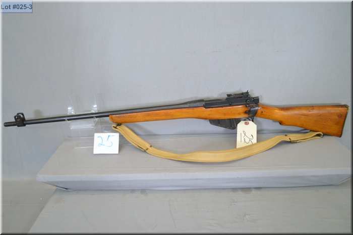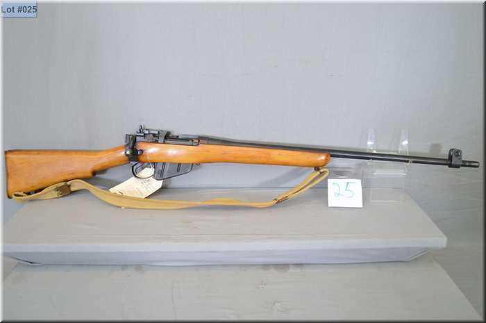 Lee Enfield # 4 MK 1 ( F ) FRT Dated 43 .303 Brit cal mag fed bolt action sporterized Rifle w/ 25 1/4" bbl [ blued finish, barrel sights, good sporterized wood w/ web sling , brass butt plate w/ trap ] Ser # JB 25599