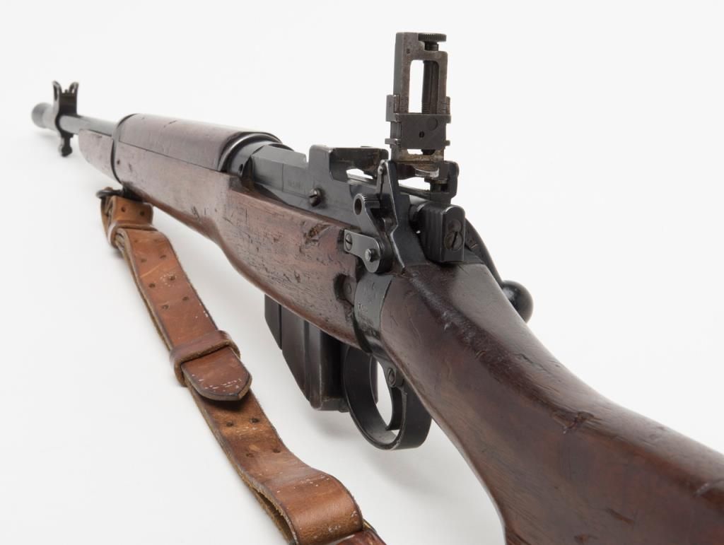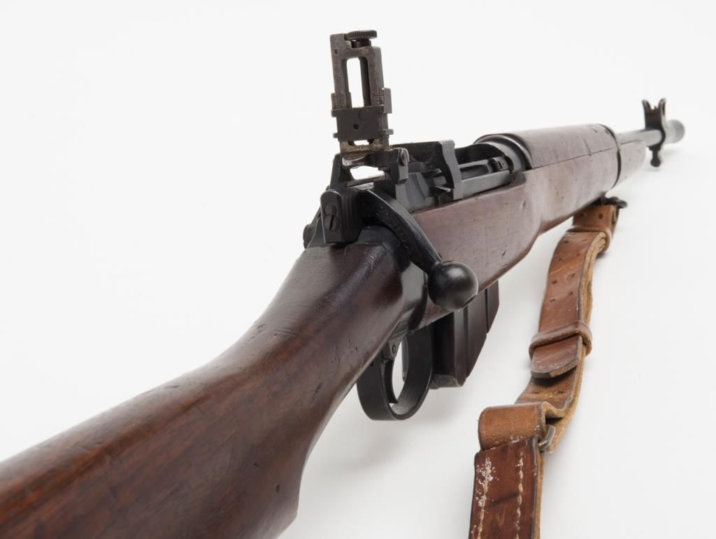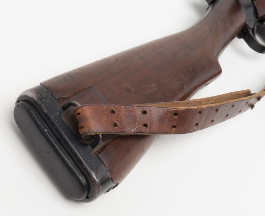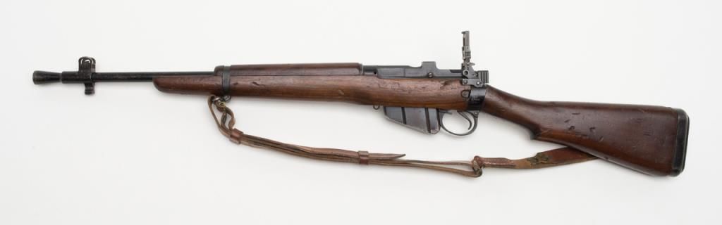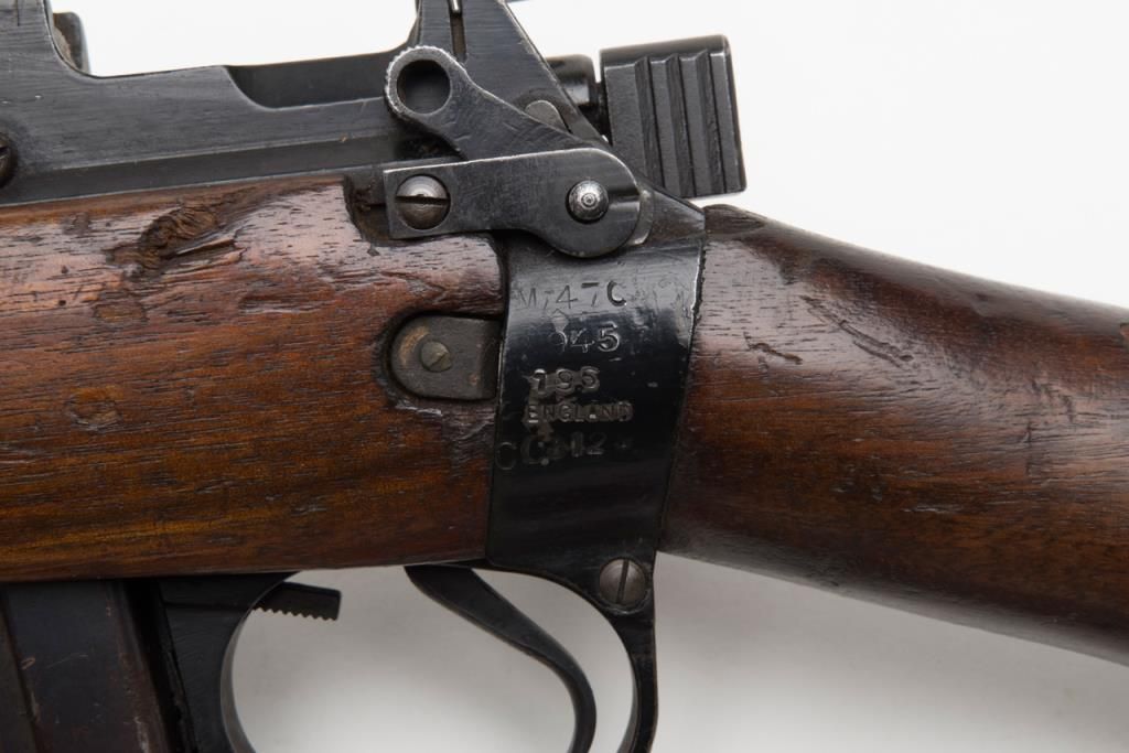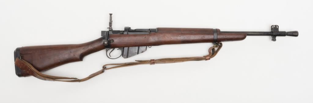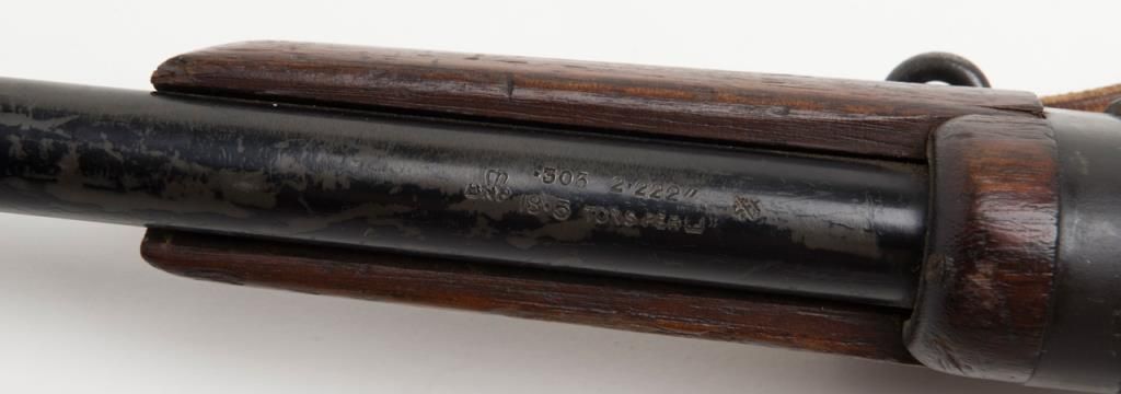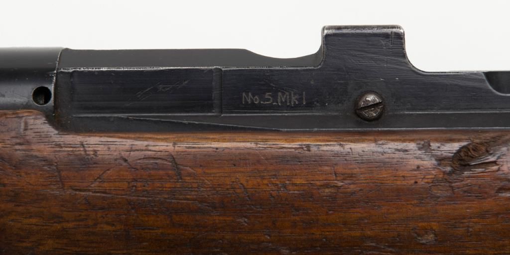 Lee-Enfield Jungle Carbine No. 5, Mk. 1, cal. .303 British, Serial #CC 3129. The carbine is in overall good condition with a 21” military blacked barrel. The carbine retains a large amount of its military black finish, with significant losses along the barrel. The wood stocks show considerable dings, dents and compressions consistent with service use. The stocks also show multiple cartouches, including the corresponding serial number on the fore end. The bore is goodand may clean, the action tight and markings legible on this fine, old carbine. The carbine retains a military style sling, metal butt plate and bayonet lug. A section of plastic has been added to the butt plate in attempt to reducerecoil. (C+R/PPT). Est.: $250-$500.