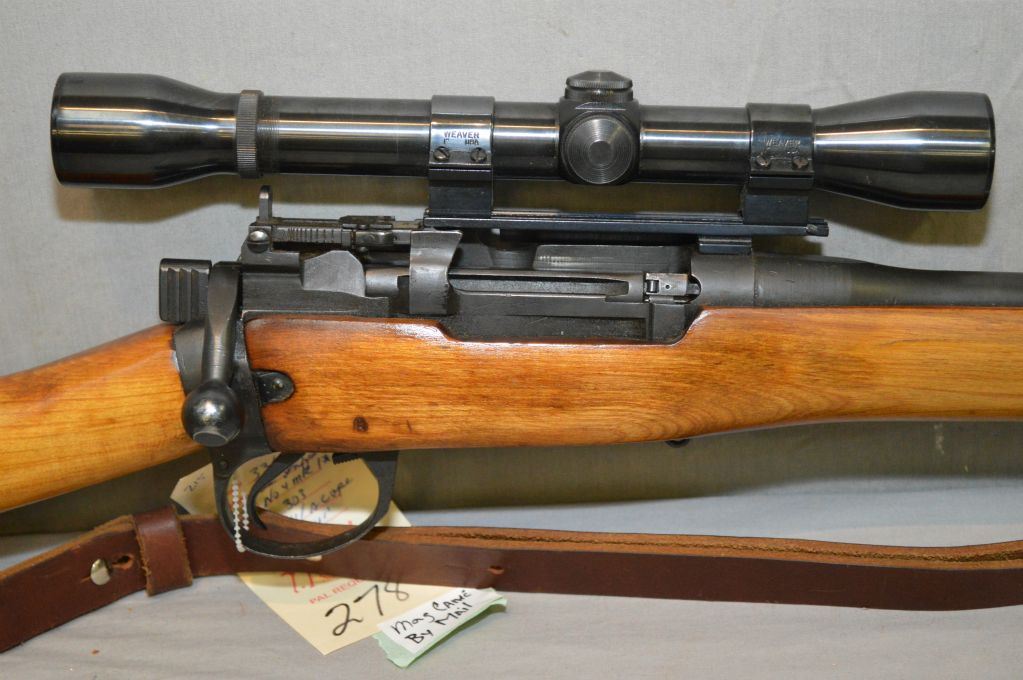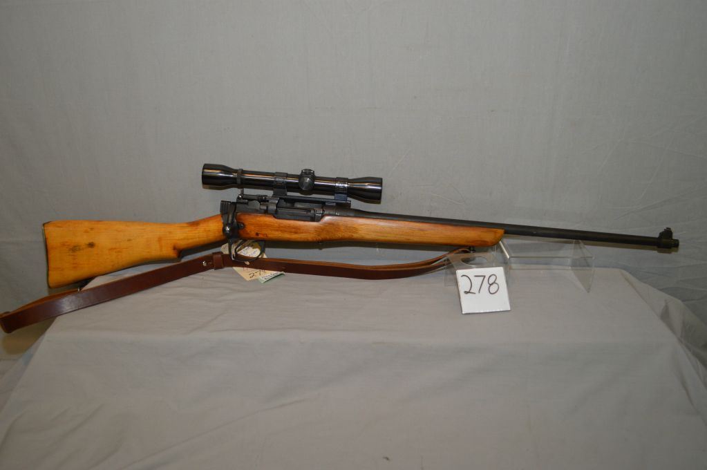 Lee Enfield ( Long Branch Dated 1943 ) Model # 4 MK I * .303 Brit cal Rifle w/ 24" bbl [ blue finish w/barrel sights, also fitted w/ Weaver K4 - F Scope, good sporterized wood, w/iron butt plate, heavy leather sling ] Ser # 33L3782