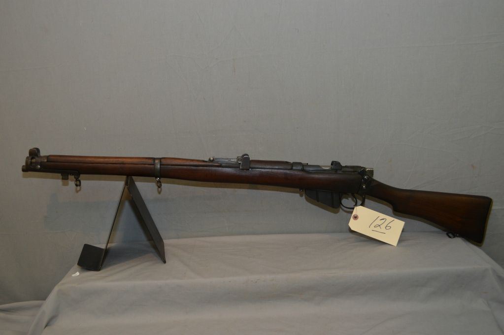 Lee Enfield Model SHT 22 Mark IV* Dated 1917 .22 LR Cal Full Wood Military Rifle w/ 25 1/4" bbl [ fading blue finish, wood chipped behind receiver on left side, proper spring style .22 LR cal mag, w/sling swivels, brass butt plate w/trap, matching numbered bolt ] Ser # A836