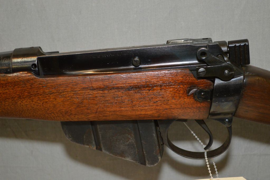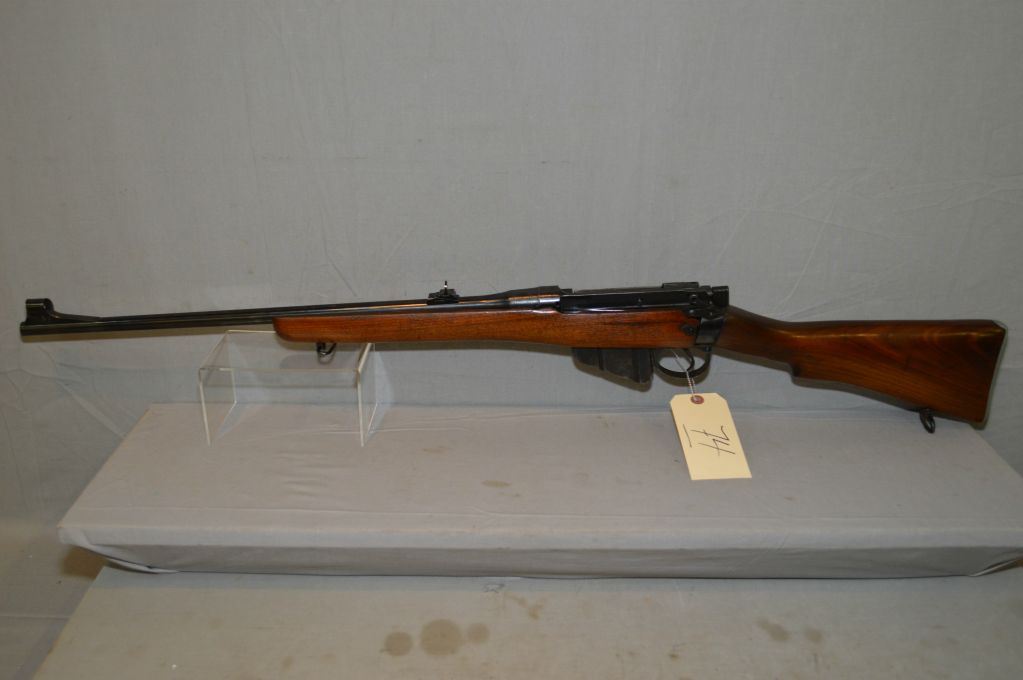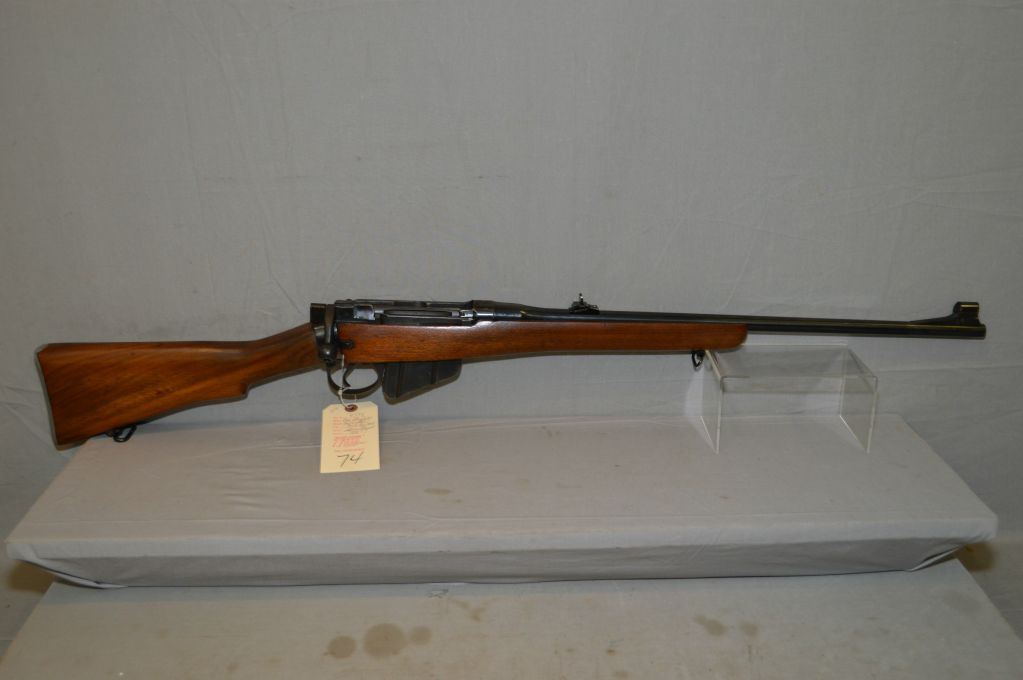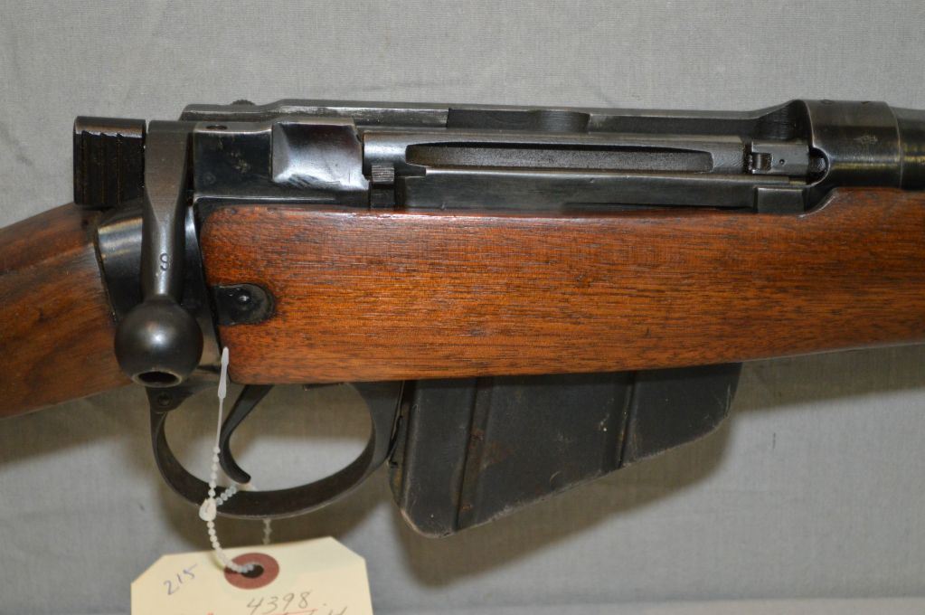 Lee Enfield No 4 Mark I .303 Brit cal Sporterized Clip Fed Bolt Action Rifle w/ 22" bbl [ blued finish, barrel sights including Williams back sight, good sporterized wood, sling swivels, butt plate w/trap, matching numbered bolt ( 5 ) ] Ser # 4398