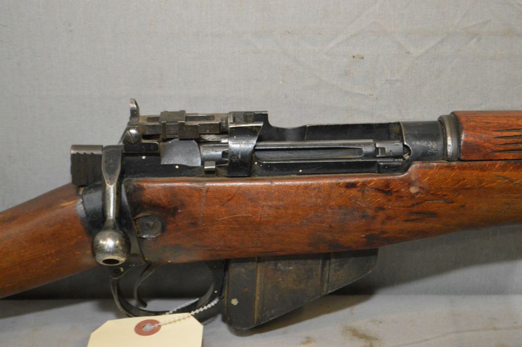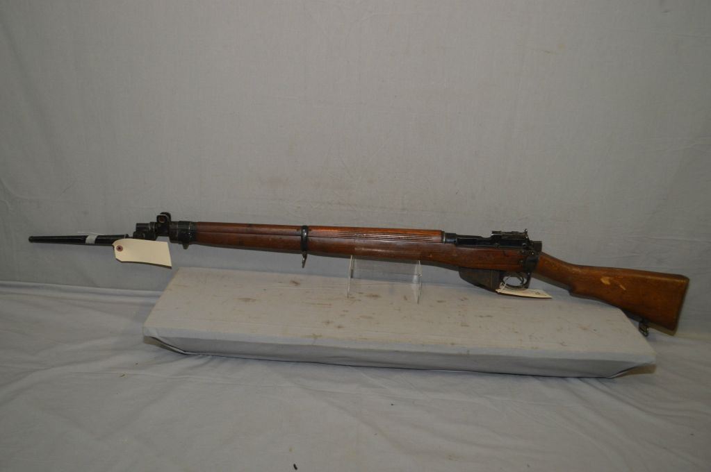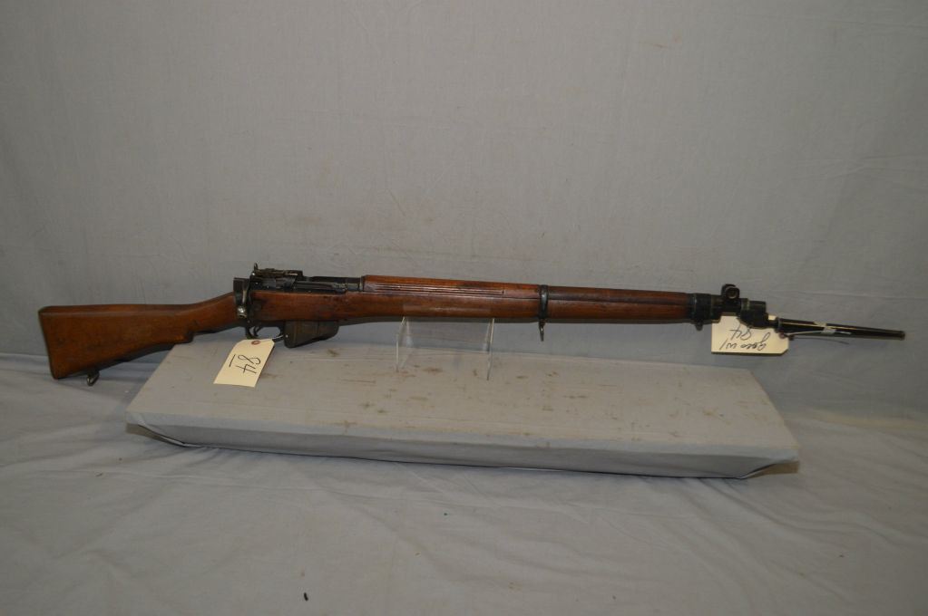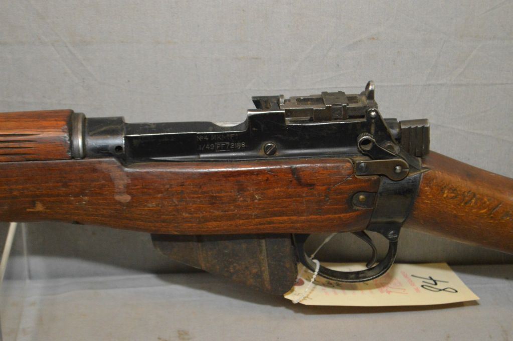 Lee Enfield No.4 Mark I ( F ) Dated 1/49 .303 Brit Cal Full Wood Bolt Action Military Rifle w/ 25 1/4" bbl [ blued finish, barrel sights, starting to fade in some areas, matching numbered bolt, wood stamped ZF on right side by brass butt plate, has two sling swivels, c/w spike bayonet & scabbard ] Ser # PF 72188