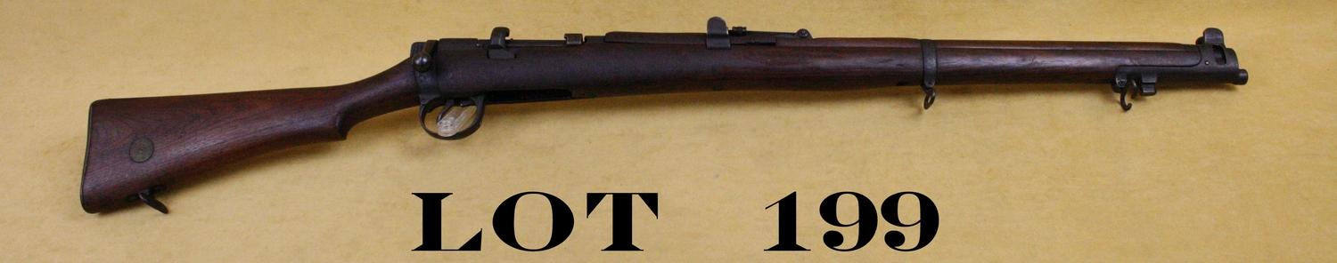 Lee Enfield bolt-action .410 converted No. 1 MK III rifle to shotgun in .410 cal., 25-1/2” barrel, military finish, three sling swivels, removable magazine, wood stock, #3377B. This gun is in overall good uncleaned condition showing considerable military blue finish, bright bore, crisp action, good markings including “1918” dated receiver; overall good wood stock with some scattered nicks and mars from storage; a carefulcleaning and oiling should greatly improve the appearance of this converted Enfield. Est.: $125--$250.