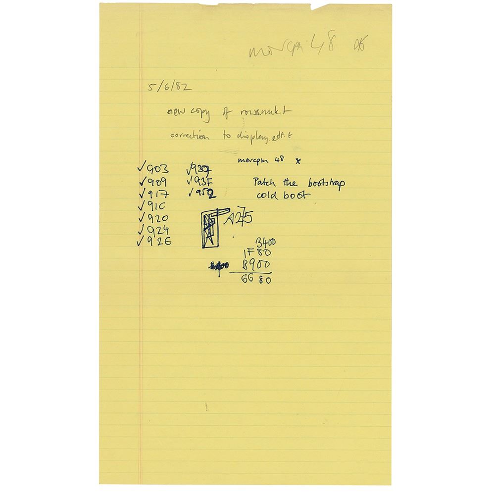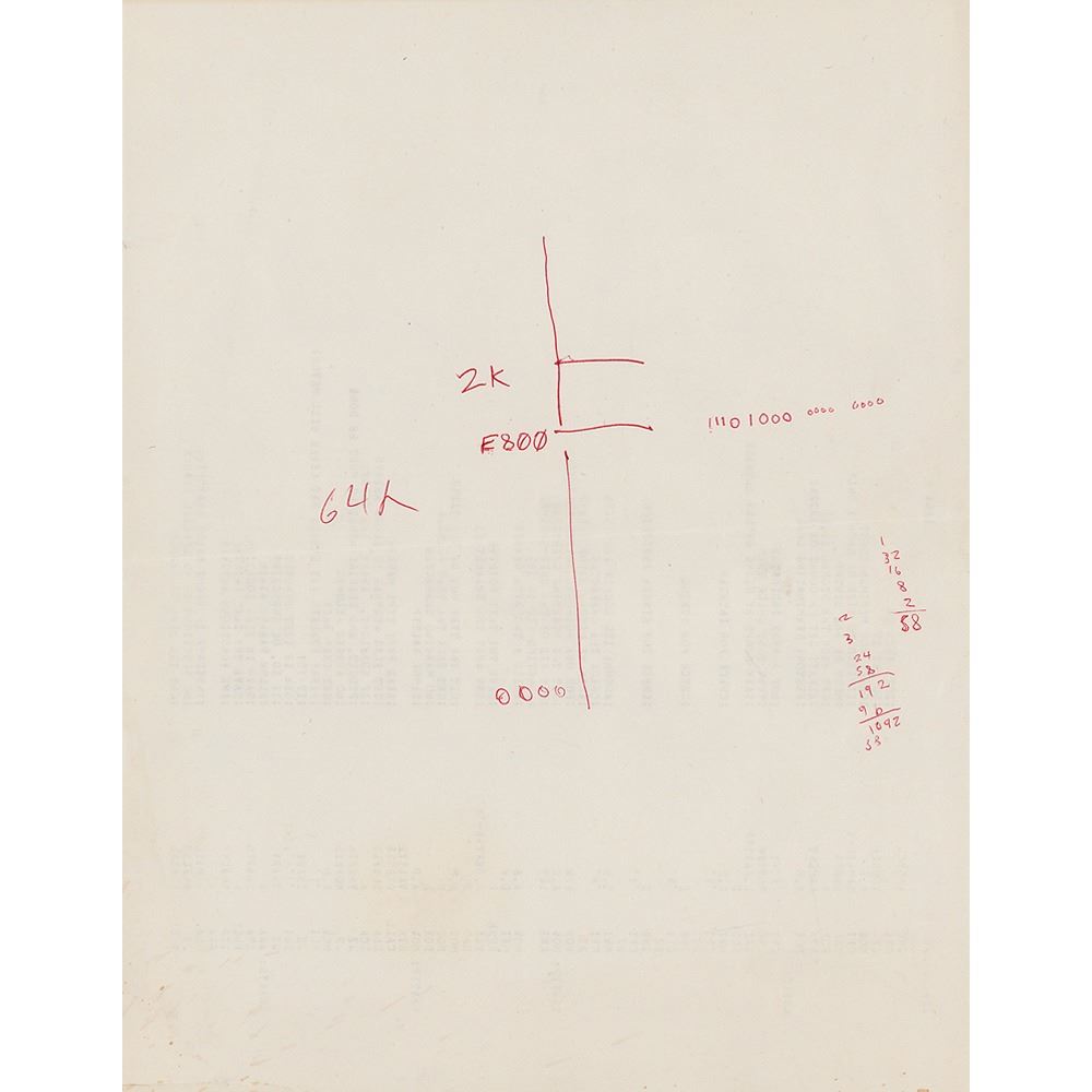 The lot includes one Expander User’s Manual and one manual of the Expander Monitor Source Code. Felsenstein notes that the user's manual is annotated on the front cover with phone numbers for Robert Marsh and Micromation (a company making disk storage systems). Inside the front cover is a yellow sheet of paper dated 5/6/82 with notations mentioning “new copy,†“corrections to display,†“movcpm 48 x,†and “Patch the bootstrap cold boot,†along with a checklist of numbers and a hexadecimal calculation of memory size. Inside at p. 36 is a single sheet of white paper with a copy of a page from another program listing with a rudimentary memory map drawn on the back in red ink—the one address shown is that of a bootstrap entry point with a binary expression of that address, the words “64K†and “2K†in addition to some arithmetic computations. The Monitor Source Code listing, dated 11/2/81, is a printout of a hexadecimal program listing with comments and appears to be a xerocopy of a tractor-feed printout.