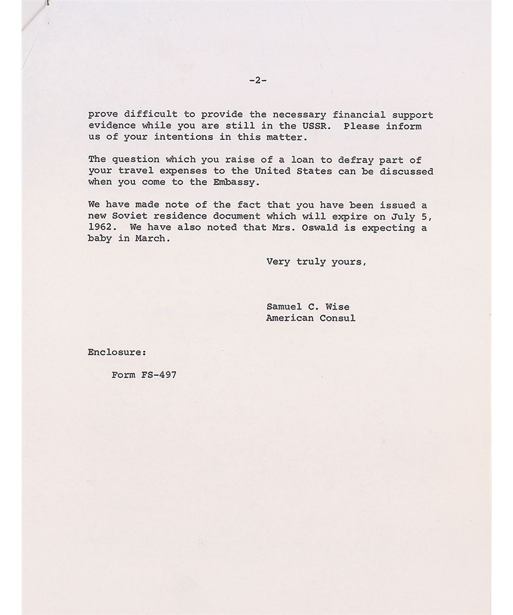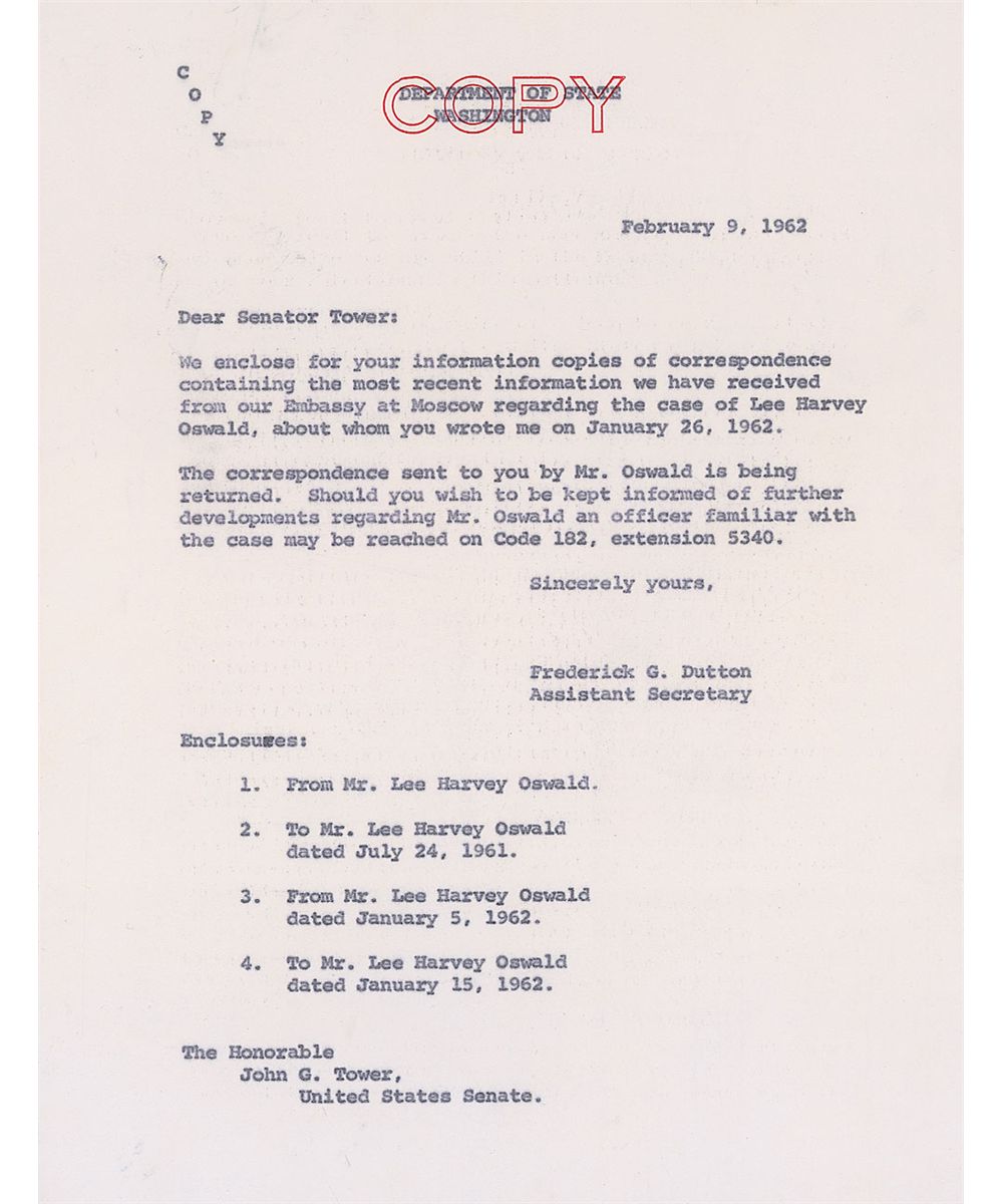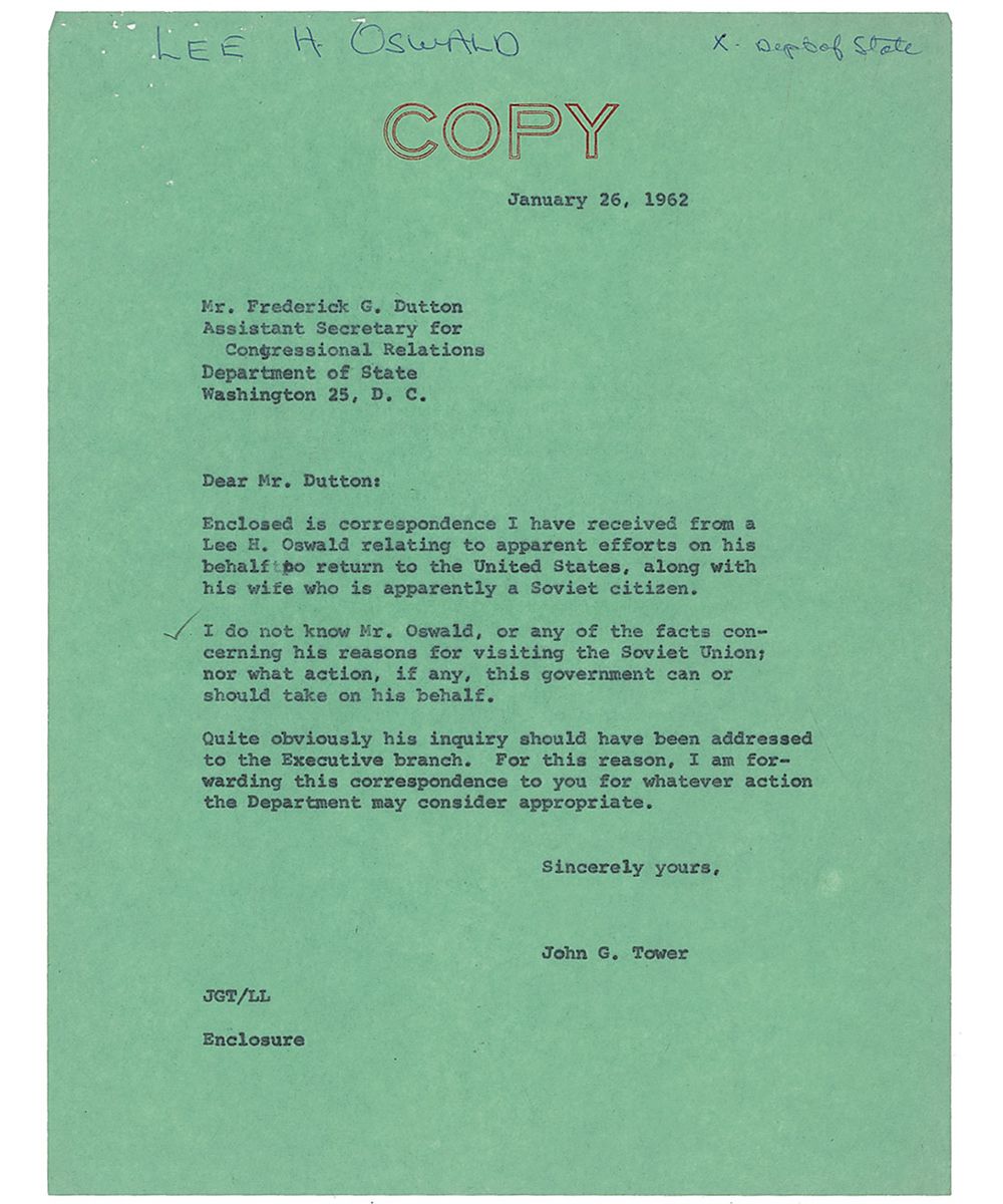After the arduous process of getting his US Passport returned, Oswald faced the tougher challenge of obtaining exit visas for himself and his now-pregnant wife from the Soviet government. After months of embassy visits and extreme pressure from Marina’s friends, coworkers, and family members to remain, Oswald grew impatient and penned this letter to Senator John G. Tower of Texas, requesting US intervention in the process. With explicit information contradicting Oswald’s claims of unwavering loyalty to the US, the Senator decided not to get involved, referring the letter instead to the State Department, where no further action was taken. Despite Tower’s lack of assistance in the matter, he faced harsh criticism following the assassination as pieces of this letter were widely published—in the news and again in the Warren Commission report—and found himself defending against accusations that he facilitated Oswald’s return. Believed to be lost, this extraordinary letter was discovered in Senator Tower’s home following his death in 1991; a remarkable find, and certainly one of the most important Oswald letters known.
