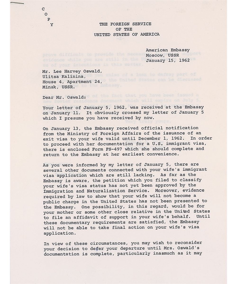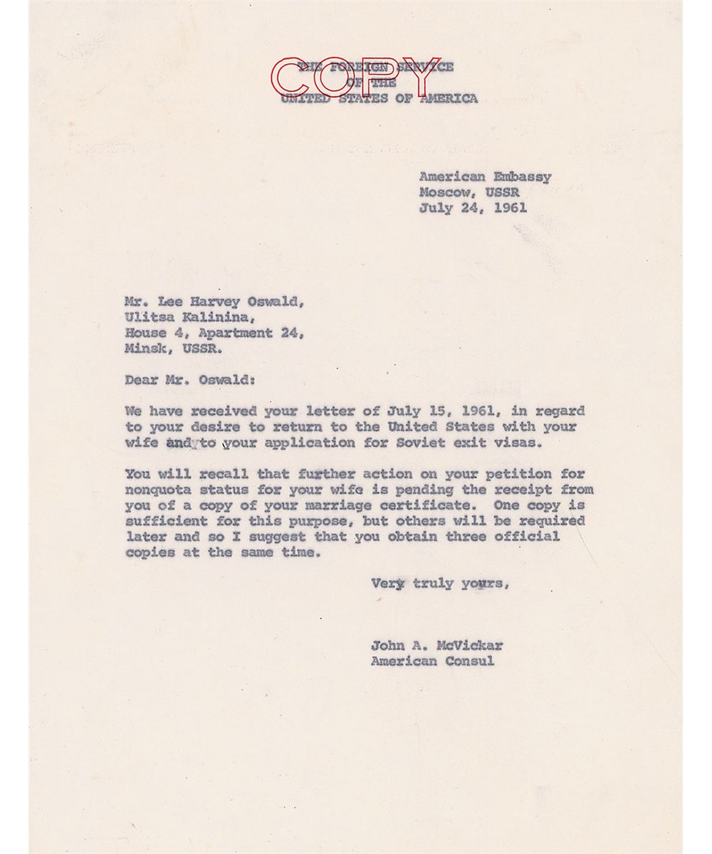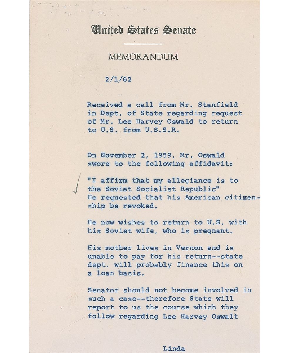 Also includes five original copies of letters and memos regarding Oswald’s request: two are retained copies of letters sent to Oswald in Minsk, and three are internal memos discussing the matter. One such memo, in part: “On November 2, 1959, Mr. Oswald swore to the following affidavit: ‘I affirm that my allegiance is to the Soviet Socialist Republic.’ He requested that his American citizenship be revoked. He now wishes to return…Senator should not become involved in such a case—therefore State will report to us the course which they will follow.” In very good condition, with scattered creases, a tear and heavier creasing to the bottom edge, paperclip impressions and numerous tack holes to the upper left, and a subtle diagonal streak of staining passing below the signature; technical flaws are mentioned for the strictest of accuracy, and the overall letter is boldly penned and quite visually appealing. Accompanied by a glossy press photo of the letter, stamp-dated on the reverse November 1963.