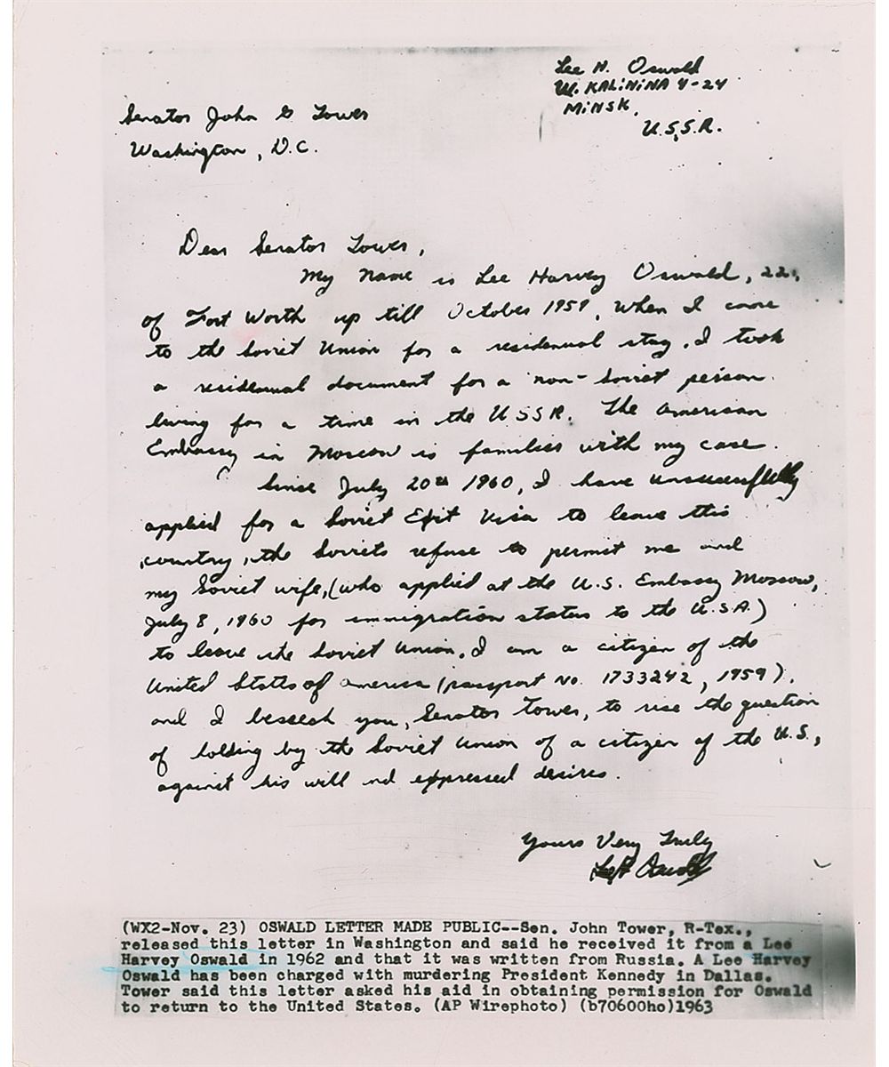 Remarkable and historically significant ALS signed “Lee H. Oswald,” one page, 8 x 11.25, no date but December 1961. Letter to Senator John Tower of Texas. In full (spelling and grammar retained): “My name is Lee Harvey Oswald, 22, of Fort Worth up till October 1959, when I came to the Soviet Union for a residenual stay. I took a residenual document for a non-Soviet person living for a time in the USSR. The American Embassy in Moscow is familier with my case. Since July 20th 1960, I have unsucessfully applied for a Soviet Exit Visa to leave this country, the Soviets refuse to permit me and my Soviet wife, (who applied at the U.S. Embassy Moscow, July 8, 1960 for immigration status to the U.S.A.) to leave the Soviet Union. I am a citizen of the United States of America (passport no. 1733242, 1959), and I beseech you, Senator Tower, to rise the question of holding by the Soviet Union of a citizen of the U.S., against his will and expressed desires.” Oswald also writes his return address in the upper right, “Lee H. Oswald, Ul. Kalinina 4-24, Minsk, U.S.S.R.”