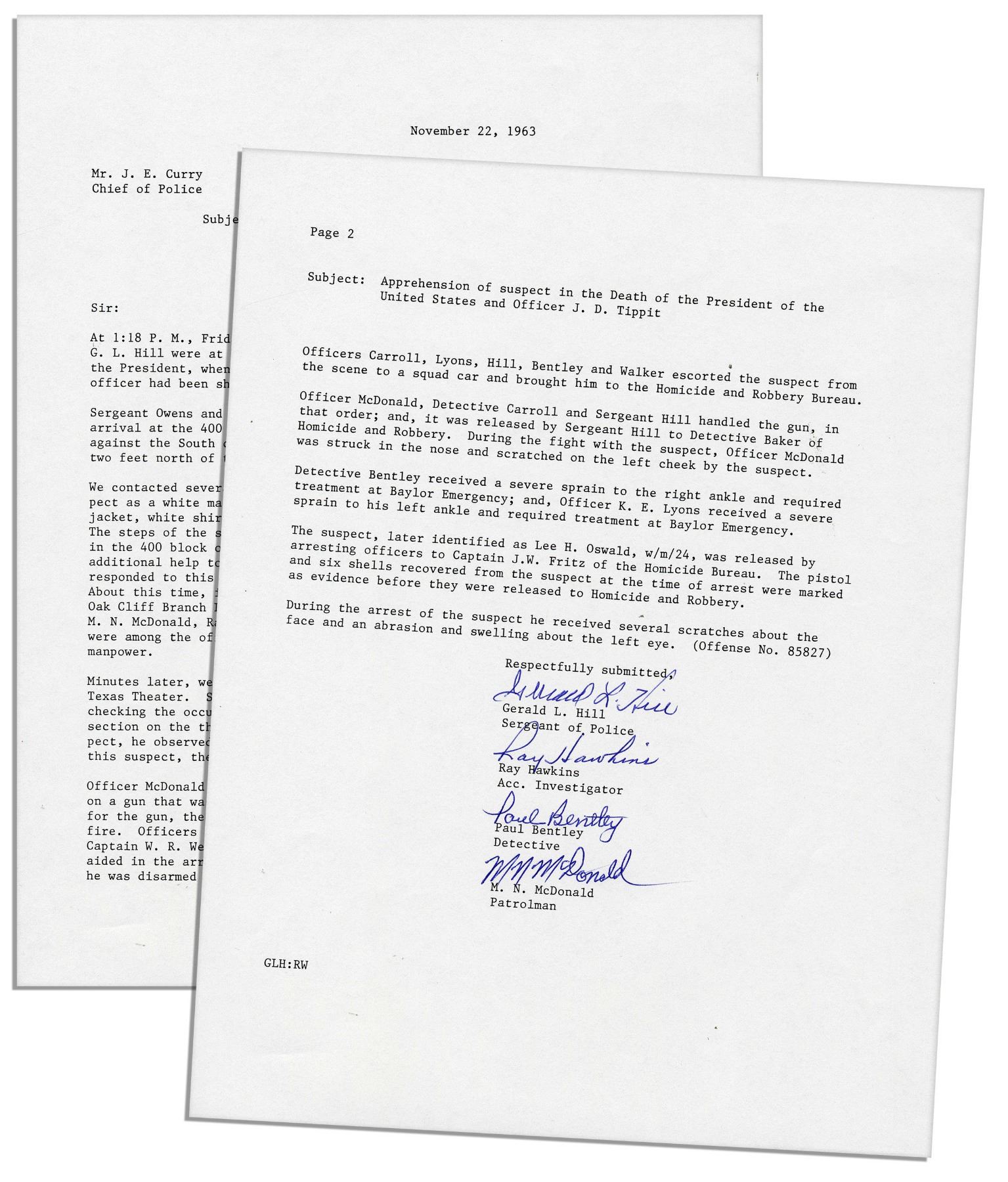 A gripping portrayal of the final moments leading up to and including the capture of President John F. Kennedy's assassin, Lee Harvey Oswald, as told by the four officers who took Oswald into custody. This souvenir document dated 22 November 1963 is addressed to Dallas Chief of Police J.E. Curry and signed by all four arresting officers: Gerald Hill, Ray Hawkins, Paul Bentley and M.N. McDonald. Letter reads in part, ''...we received information via the police radio that an officer had been shot...There was a pool of blood about two feet north of the squad car in the street...we received additional information that the suspect was in the Texas Theater...Officer McDonald...observed the arrested party sitting in the third seat. As he approached this suspect, the suspect said, 'This is it', and sprang from the seat. Officer McDonald began to grapple with the suspect and the suspect got his hand on a gun that was stuck inside his shirt. As the officer and the suspect wrestled for the gun, the suspect pulled the trigger once and the gun snapped, but did not fire...after a struggle in which the suspect resisted violently he was disarmed and handcuffed...'' Two page document on two sheets measures 8.5'' x 11''. Near fine condition. With additional page showing the four officers signing the document.