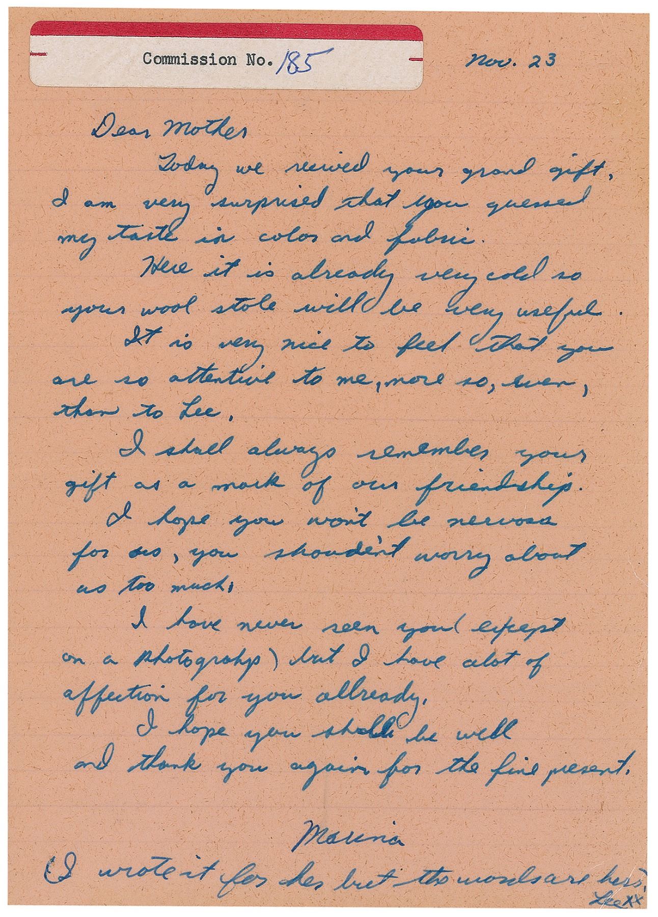 ALS, one page, lightly-lined, 5.5 x 8, November 23, [1961]. Letter written in Oswald’s hand for his wife to his mother, signed by Oswald on her behalf, “Marina,” and signed again by Oswald at the conclusion of a short postscript, “Lee xx.” In full: “Today we received your grand gift, I am very surprised that you guessed my taste in color and fabric. Here it is already very cold so your wool stole will be very useful. It is very nice to feel that you are so attentive to me, more so, even, than to Lee. I shall always remember your gift as a mark of our friendship. I hope you won’t be nervous for us, you shouldn’t worry about us too much. I have never seen you (except on a photograhp [sic]) but I have a lot of affection for you allready [sic]. I hope you shall be well and thank you again for the fine present.” At the bottom Oswald writes, “(I wrote it for her but the words are hers), Lee xx.” This letter was an official exhibit (No. 185) in the Warren Commission investigation into JFK’s assassination and, like most of the exhibits, is protectively and permanently soft-laminated. In fine condition. Oswald noted in a diary kept during this period—with the sentiment clearly expressed here as well—that Marina’s mother-in-law seemed more attentive to her than to her own son. Two years after composing this letter for his wife—almost to the day—Oswald assassinated President John F. Kennedy. The Warren Commission used Oswald’s correspondence in their determination of what drove this assassin to make his appearance on the sixth floor of the Texas School Book Depository that November afternoon. From the collection of Dr. John K. Lattimer, the first non-governmental medical specialist to review evidence in the Kennedy assassination.