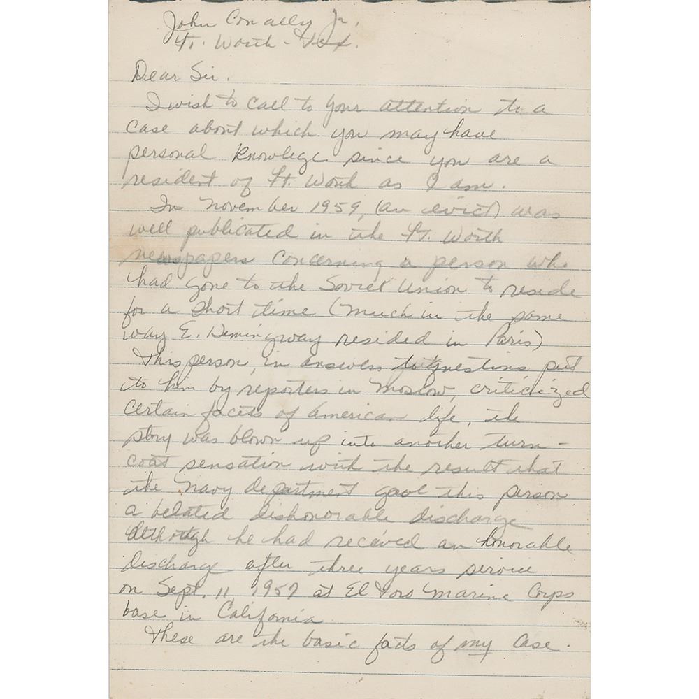 In this draft of his letter to Connally, Oswald demands that the then-secretary of the Navy "repair the damage done" to him and his family with the dishonorable discharge, menacingly exclaiming, "I shall employ all means to right this gross mistake or injustice to a bona fied U.S. citizen and ex-serviceman." By the time Connally received the letter (dated January 30, 1961), he was no longer with the Navy, having announced his retirement at the close of 1961 to run in the upcoming gubernatorial election, and happily passed it to his successor, washing his hands of Oswald until the two would meet again on that tragic day in November. Connally was seriously injured while riding in the president's car, suffering from major wounds in his chest, wrist and thigh—the only other victim wounded in the shooting that took President Kennedy's life.