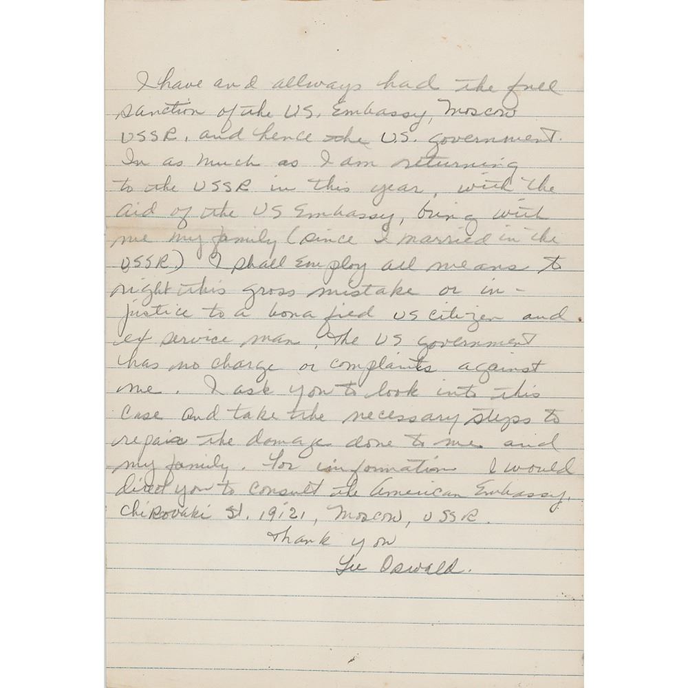 ALS in pencil, signed “Lee Oswald,” two pages, 7.25 x 10.5, no date but circa January 1961. Handwritten draft of a letter to John Connally, Jr., in part (spelling and grammar retained): "I wish to call to your attention to a case about which you may have personal knowledge since you are a resident of Ft. Worth as I am. In November 1959, (an event) was well publicated in the Ft. Worth newspapers concerning a person who had gone to the Soviet Union to reside for a short time (much in the same way E. Hemingway resided in Paris). This person, in answers to questions put to him by reporters in Moscow, criticized certain facets of American life, the story was blown up into another turncoat sensation with the result that the Navy department gave this person a belated dishonorable discharge although he had received an honorable discharge after three years service on Sept. 11, 1957 at El Toro Marine Corps base in California. These are the basic facts of my case. I have and allways had the full sanction of the U.S. Embassy, Moscow USSR, and hence the U.S. government. In as much as I am returning to the USSR [sic, meaning USA] this year, with the aid of the U.S. Embassy, bring with me my family (since I married in the USSR.) I shall employ all means to right this gross mistake or injustice to a bona fied US citizen and ex service man. The US government has no charge or complaints against me. I ask you to look into this case and take the necessary steps to repair the damage done to me and my family. For information I would direct you to consult the American Embassy, Chikovski St. 19/21, Moscow, USSR." In fine condition.