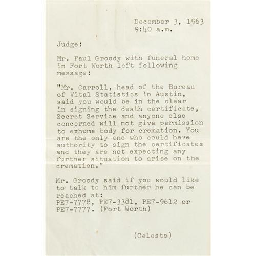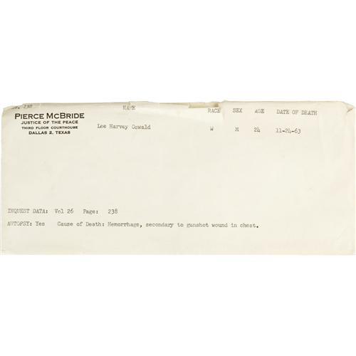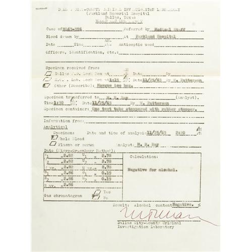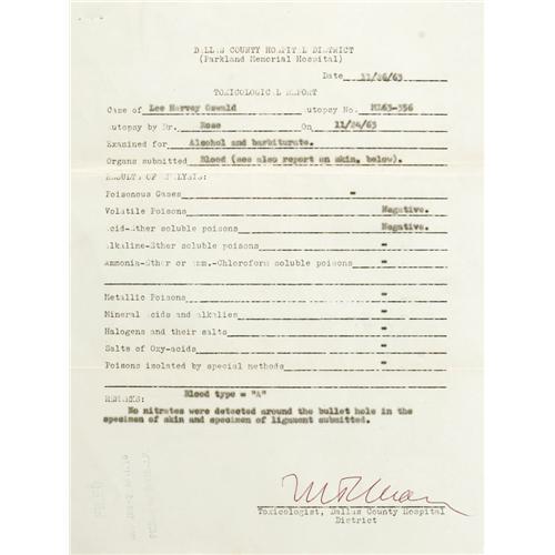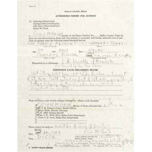 <B>Lee Harvey Oswald: An Important Group of Documents Relating to the Autopsy of John F. Kennedy's Assassin.</B></I> This fascinating lot consists of: <BR><BR><B>1).</B></I> Carbon copy of the Toxological Report, on original mimeographed form, and actually signed in ink by the Dallas County Toxicologist (signature illegible). Dated 11/24/63, the report finds Oswald negative for poisons, and notes that "<I>no nitrates were detected around the bullet hole...</B></I>" Rubber-stamped as filed by "Pierce McBride, J.P." (see description of included items). <BR><B>2).</B></I> A similar Blood Alcohol Report, also signed in ink. It is dated 11/25/63, and quaintly notes that the specimen was obtained from the "morgue ice box," it concludes that Oswald was "Negative for alcohol." <BR><B>3).</B></I> The third and most significant document is a carbon of the completed "Authorized Permit for Autopsy" issued to the Pathology Dept. of Parkland Memorial Hospital, and asserting that "upon my own determination...this autopsy is necessary." Signed by Justice of the Peace Pierce McBride. The document shows that five copies were made, for law enforcement and county government agencies, and this is McBride's own copy. The autopsy was requested by "J.R. Leavelle of Homicide", and apparently at that time in Dallas a justice of the peace was authorized to sign off on such a request. Under "pertinent facts regarding death", it states: "Shot with one bullet from .38 caliber revolver in basement of City Hall. Bullet entered in front of left side, going through body and lodging just under skin on right side. Assailant in custody." It also notes, "Please release body to: 'Undertaker of choice of family'" A handwritten postscript at the bottom declares: "<I>11-24-63, Dr. Earl Rose reported just after autopsy: Cause of death - massive hemmorage, secondary to gunshot wound - PMcB by phone to Mrs. (illegible name)</B></I>" <BR><B>4).</B></I> The final item isË