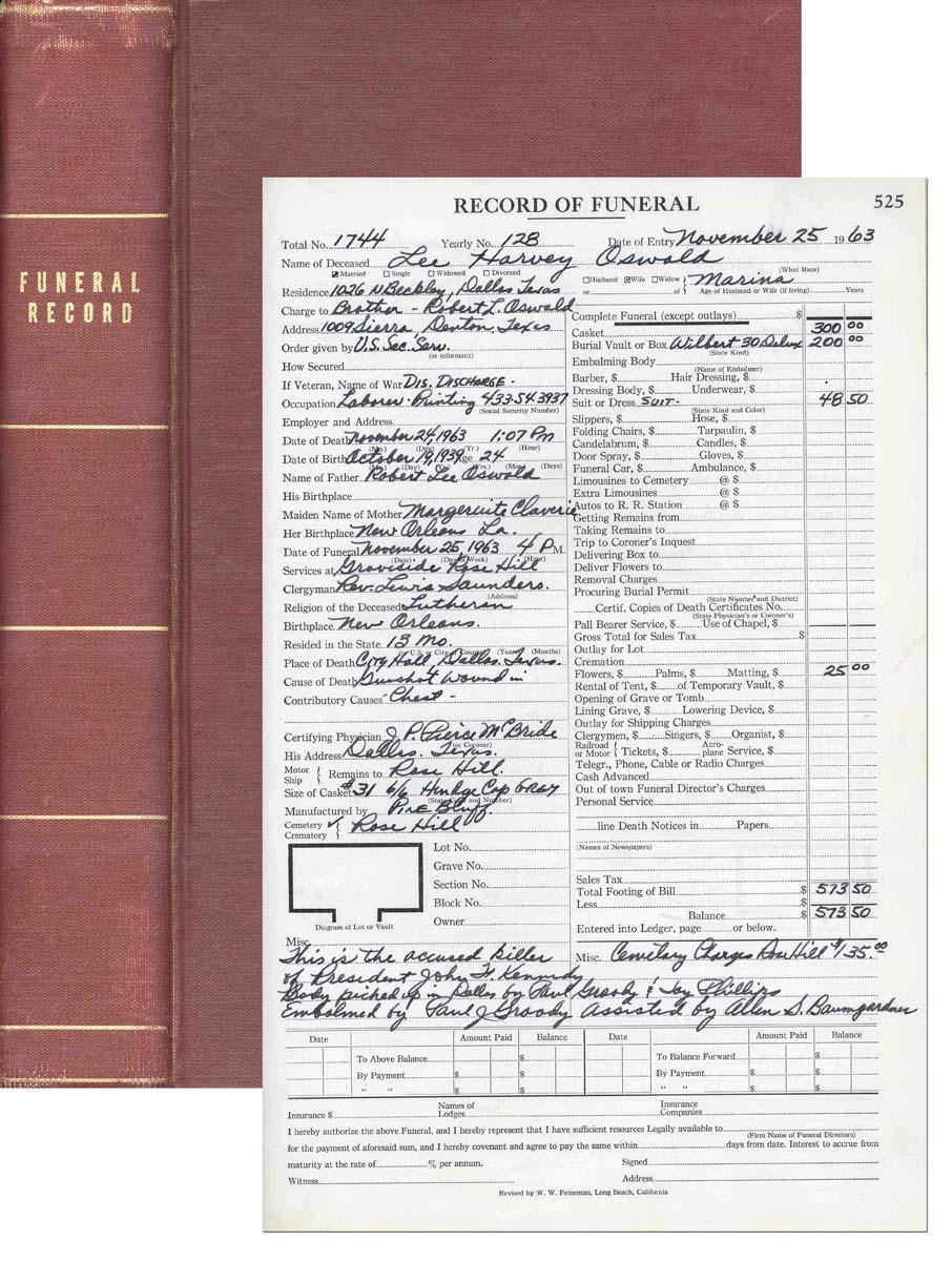 ''Funeral Record'' logbook for the Miller Funeral Home, who handled the burial of Lee Harvey Oswald. Oswald's funeral is listed on page 525 with the following noted, ''This is the accused killer of President John F. Kennedy.'' Oswald's mother, brother and wife are listed as relatives; also listed is Oswald's place of birth, residence, cause of death, etc. Large book measures 9.25'' x 15'' and runs 608 pages. In very good condition with nearly all pages filled out. Accompanied by Letter of Authenticity by Funeral Director Allen Baumgardner.