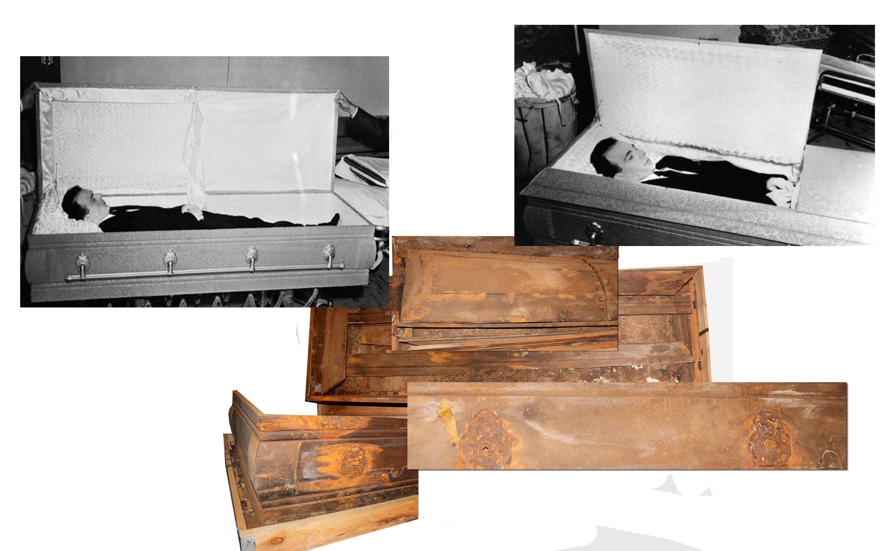 Original pine coffin that held the body of Lee Harvey Oswald from his burial on 25 November 1963 until his exhumation on 4 October 1981. Amidst conspiracy theories that a look-alike Russian agent was actually buried in place of Oswald, a fierce legal battle erupted between Robert and Marina Oswald with the former trying to stop the exhumation and the latter pushing it forward. Marina's side prevailed, forcing an exhumation to determine who was actually buried in Oswald's grave. As Lee Harvey Oswald's coffin was lifted, evidence of extensive water damage to the casket was apparent -- the cover was weak in many areas and in one place had caved in partially exposing the remains. The coffin's wood exterior was very soft from moisture damage, and had dark areas of discoloration. Visible along the sides were the tarnished original metallic ornamentation. The interior of the casket also showed splotchy dark discoloration and moisture-softening of the wood. A portion of the original fabric that lined the top of the casket had fallen upon the decomposed remains. After a thorough medical examination, the pathologists assigned to the case officially identified the body as Oswald's as dental records positively matched. At a press conference later that day the following famous statement was made, ''The remains in the grave marked as Lee Harvey Oswald are indeed Lee Harvey Oswald.'' After the news conference, Oswald's remains were transported back to Rose Hill Cemetery for re-interment in a new casket and vault. The original deteriorated coffin offered here, measures 80'' long x 24'' deep, with the thickness of the sides of the casket approximately one inch. Sitting on wood crate which measures 84'' x 24''. Accompanied by a Letter of Authenticity by Funeral Director Allen Baumgardner, who assisted at the original embalming of Lee Harvey Oswald and later purchased the Miller Funeral Home along with all of its property.
