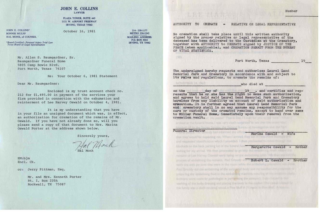 Typed letter signed by Hal Monk, a lawyer representing Marina Oswald in the process of exhuming the body of her late husband. Addressed to Allen Baumgardner whose funeral home performed the exhumation, letter dated 16 October 1981 confirms payment for the process and requests that a copy of the authorization to cremate be mailed to Marina. Lot also includes three unsigned copies of the authorization, listing Marina, Margeruite Oswald and Robert L. Oswald as relatives. Accompanied by a Letter of Authenticity by Allen Baumgardner.