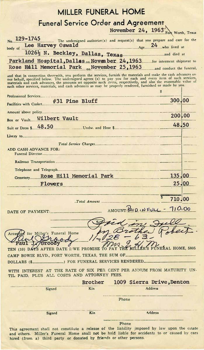 Original ''Funeral Service Order and Agreement'' for the burial of Lee Harvey Oswald. Document is from the Miller Funeral Home, dated 24 November 1963, listing Oswald's age, place of death and particulars of his casket, a simple pine coffin costing $300.00 The service totaled $710.00 which was noted as being ''Paid in full by Brother Robert.'' Single page 6.5'' x 11'' document is in very good condition with light creasing to the bottom left side. With a Letter of Authenticity from funeral owner Allen Baumgardner.