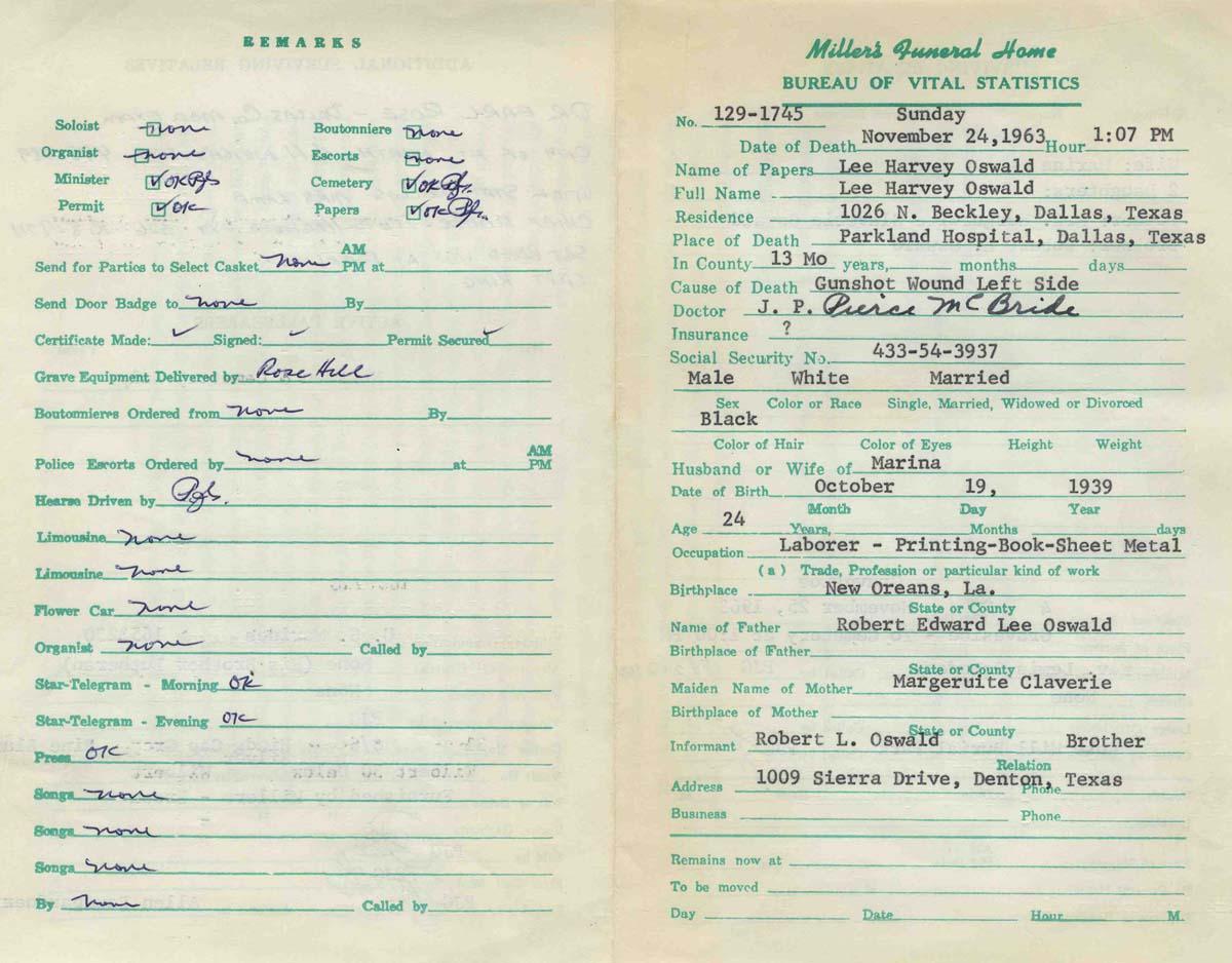 Original 1963 ''Vital Statistics Form'' filled out by Miller's Funeral Home, who handled the embalming and burial of Lee Harvey Oswald. Four page document measuring 5.5'' x 8.5'' lists Oswald's social security number, date of birth and death, relatives, cause of death (''Gunshot Wound Left Side''), etc. It also includes details of the funeral, listing the pallbearers as ''Newsmen & Cemetery Help'' and the time of service at 4:00 p.m. on 25 November. Includes a Letter of Authenticity from funeral owner Allen Baumgardner. Near fine condition.